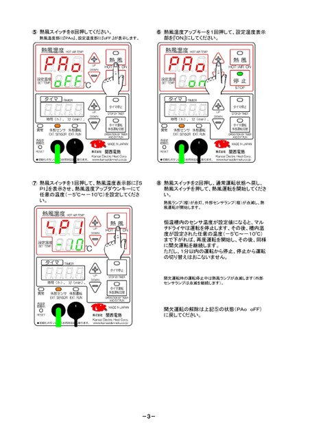 ⑤熱風スイッチを8回押してください。熱風温度部に『PAo』、設定温度部に『oFF.』が表示します。⑥熱風温度アップキーを1回押して、設定温度表示部を『ON』にしてください。⑦熱風スイッチを1回押して、熱風温度表示部に『SP1』を表示させ、熱風温度アップダウンキーにて任意の温度(-5℃~-10℃)を設定してください。⑧熱風スイッチを2回押し、通常運転状態へ戻し、熱風スイッチを押して、熱風運転を開始してください。熱風ランプ(橙)が点灯、外部センサランプ(橙)が点滅し、熱風運転が開始します。恒温槽内のセンサ温度が設定値になると、マルチドライヤは運転を停止します、その後、槽内温度が設定された任意の温度(-5℃~-10℃)まで下がれば、再度運転を開始し、その後、同様に間欠運転を継続します。ただし、1分以内の運転から停止、停止から運転の切り替えはおこないません。間欠運転時の運転停止中は熱風ランプが点滅します(外部センサランプは点滅を継続します)。間欠運転の解除は上記⑤の状態(PAooFF)に戻してください。-3-