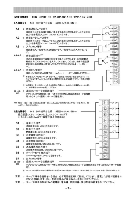 【ご使用機種】TSK-52HT・62・72・82・92・102・122・132・200《入力端子》M320P端子台上段締付トルク:0.5N・mA1:外部運転入/切端子外部信号にて送風機を運転/停止する場合に使用します。入力は接点出力(端子電圧DC24V7mA以下)対応です。A2:外部ヒータ入/切端子外部信号にてヒータの入/切をおこなう場合に使用します。入力は接点出力(端子電圧DC24V7mA以下)対応です。A3:入力コモン端子外部運転入/切端子A1と外部ヒータ入/切端子A2用入力コモンです。外部温調端子※1A4・A5:他の温度調節計にて温度を制御する場合に使用します。SSR駆動逆動作出力(DC12~24V)を入力してください。このとき、本体の温度調節計は吐出口温度上限リミッタとしてご使用ください(A4→+、A5→-)。A6・A7:外部センサ端子※※外部センサK350Aの端子K+→A6へ、K-→A7へ接続してください。外部運転入/切端子A1と外部ヒータ入/切端子A2の端子電圧はDC24V7mA以下となります。よって、この電圧を開閉できる接点容量を持つリレー等をご用意ください。外部運転、及び外部ヒータ入力を使用する場合は、本機の外部運転スイッチを押して、外部運転モードへ変更してください。A8・A9・A10:遠隔コントローラ接続用端子オプションにて遠隔コントローラをご使用になる場合の遠隔コードの接続用コネクタです(遠隔コントローラ通信用)。※1TSK-122・132・200のみDC4~20mAを入力してください(4mAでヒータ出力0%、20mAでヒータ出力100%)。《出力端子》M320P端子台上段締付トルク:0.5N・m接点容量DC5V10mA以上、DC30V1A以下出力コモン合計3A以下(無電圧接点信号出力)送風出力端子送風機運転中、ONになる端子です。熱風出力端子熱風運転中、ONになる端子です。温度異常出力端子温度異常時、ONになる端子です。温度警報出力端子温度警報出力時、ONになる端子です。送風機異常出力端子送風機異常出力時、ONになる端子です。オーバーヒート出力端子オーバーヒート時、ONになる端子です。出力コモン端子遠隔コントローラ接続用端子オプションにて遠隔コントローラをご使用になる場合の遠隔コードの接続用端子です(遠隔コントローラ電源用)。B9-B10の遠隔コントローラ電源端子には電圧DC24Vが発生していますので絶対に短絡しないでください。短絡すると必ず故障します。サービス端子を使用される場合、必ず電源を遮断して配線してください。通電した状態で配線をおこなうと感電します。また、配線後は必ず端子カバーを取り付けてください。サービス端子の配線はAC電源線、電力線、高調波線と隣接配線や結束をさけてください。-7-::::::::※::B1B2B3B4B5B6B7B8・B9・B10注意注意