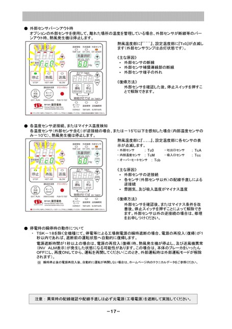 熱風温度部に『---』、設定温度部に各センサの表示が点滅します。・外部センサ・内部温度センサ:Tc0:TcM・吐出口センサ・吸入口センサ:TcA:Tcc・オーバーヒートセンサ:Tcb外部センサの逆接続各センサ(外部センサ以外)の配線手直しによる逆接続雰囲気、及び吸入温度がマイナス温度・・・《主な原因》《復帰方法》外部センサを確認後、またはマイナス条件を改善後、停止スイッチを押すことによって解除できます。外部センサ以外の逆接続の場合は、修理をお申しつけください。熱風温度部に『---』、設定温度部に『Tc0』が点滅します(外部センサランプは点灯状態です)。《復帰方法》外部センサを確認した後、停止スイッチを押すことで解除できます。外部センサの断線外部センサ補償導線部の断線外部センサ端子の外れ・・・《主な原因》●外部センサバーンアウト時オプションの外部センサを使用して、離れた場所の温度を管理している場合、外部センサが断線等のバーンアウト時、熱風発生機は停止します。●各温度センサ逆接続、またはマイナス温度検知各温度センサ(外部センサ含む)が逆接続の場合、または-15℃以下を感知した場合(内部温度センサのみ-10℃)、熱風発生機は停止します。●停電時の瞬停時の動作について・TSK-18を除く全機種にて、停電等による工場側電源の瞬時遮断の場合、電源の再投入(復帰)が1秒以内であれば、遮断前の運転状態へ自動的に復帰します。電源遮断時間が1秒以上の場合は、電源の再投入(復帰)時、熱風発生機が停止し、及び送風機異常(INVALM表示)が発生した状態になる可能性があります。この場合は、本体のブレーカをいったんOFFにし、再度ONしてから、運転を再開してください(このとき、外部運転時は外部運転モードが解除されます)。※瞬時停止後の電源再投入後、自動的に運転が再開しない場合は、ホームページ内のテクニカルデータをご参照ください。注意:異常時の配線確認や配線手直しは必ず元電源(工場電源)を遮断して実施してください。-17-
