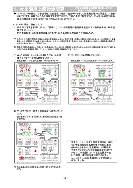 4.吐出温度上限設定変更※変更は外部運転機能を解除した停止状態にて実施してください。●オプションの外部センサを使用時、吐出温度は吐出口温度リミッタとして熱風発生機の上限温度にて制御されています。本機ではこの上限設定を変更できます。任意の温度に設定することにより、熱風発生機の最高吐出温度を制限できます(出荷時の設定は350℃です)。《このような場合に便利です。》・・※※炉内等の温度を管理し、同時にご使用になっている配管等の最高使用温度以下で熱風発生機の吐出温度を管理したい。炉内等の乾燥、または加熱温度と対象物への最高供給温度の両方を制御したい。外部センサの温度と熱風発生機の吐出口上限温度は、いずれか早く設定値へ到達した温度で制御されます。よって、外部センサ温度設定と吐出上限温度設定の差が少ない場合は、外部センサ温度が昇温する前に吐出口上限温度にて制御され、目標温度に到達しない場合がありますので、ご注意ください。熱風発生機の温度表示は外部センサの温度のみとなり、吐出口上限温度は表示されません。吐出口上限の温度を表示したい場合は、外部に別途温度調節計を設けて、サービス端子の外部温調機能をご使用ください。①ロック解除後、モードキーを押しながら、熱風温度のダウンキーを押し続けてください。②モードキーを6回押してください。熱風温度部に『AIF』、設定温度部に『HLW』が表示します。熱風温度部に『S_A』、設定温度部に『350』が表示します。③アップダウンキーにて任意の温度へ変更してください。設定後はモードキーを3回押して、通常運転状態の表示へ戻してください。変更された吐出温度上限設定温度は、外部センサ使用時に熱風発生機の吐出口温度を制御するもので、温度異常により熱風発生機を停止させる安全回路の温度ではありません(この変更においても温度異常の吐出口温度上限設定温度は変更されません)。よって、この変更温度にて安全回路は作動しません。※吐出温度上限設定変更後は、再度ロックをかけて運転してください。-4-