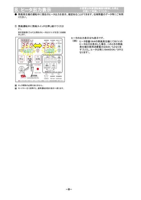 8.ヒータ出力表示※変更は外部運転機能を解除した停止状態にて実施してください。●熱風発生機の運転中に現在のヒータ出力を表示、確認知ることができます。仕様熱量のデータ等にご利用ください。①熱風運転中に熱風スイッチを押し続けてください。設定温度部に『oUT』と現在のヒータ出力(%)が交互に点滅表示します。ヒータの出力表示は%表示です。《例》ヒータ容量10kWの熱風発生機にて80(%)のヒータ出力を表示した場合、このときの熱風発生機の使用消費電力は8kW/hとなります(ただし、ヒータは常に10kWのON/OFFとなります)。ロック解除の必要はありません。モードキーを1回押すと、通常運転状態の表示へ戻ります。※※-8-