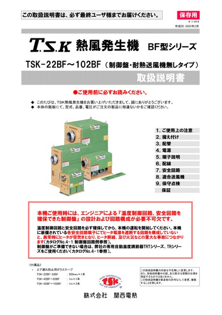この取扱説明書は、必ず最終ユーザ様までお届けください。保存用4・1-014作成日:2023年2月熱風発生機BF型シリーズTSK-22BF~102BF(制御盤・耐熱送風機無しタイプ)取扱説明書●ご使用前に必ずお読みください。このたびは、TSK熱風発生機をお買い上げいただきまして、誠にありがとうございます。本体の銘板にて、型式、品番、電圧がご注文の製品に相違ないかをご確認ください。◆◆1.ご使用上の注意2.据え付け3.配管4.電源5.端子説明6.配線7.安全回路8.適合送風機9.保守点検保証本機ご使用時には、エンジニアによる『温度制御回路、安全回路を確保できた制御盤』の設計および回路構成が必要不可欠です。温度制御回路と安全回路を必ず確保してから、本機の運転を開始してください。本機に装備されている各安全回路端子にてヒータ電源を遮断する回路を構成していないと、異常時にヒータが空焚きとなり、ヒータ断線、及び火災などの重大な事故につながります(カタログNo.4-1制御盤回路例参照)。制御盤がご準備できない場合は、弊社の専用自動温度調節器TRTシリーズ、TRシリーズをご使用ください(カタログNo.4-1参照)。《付属品》・エア漏れ防止用ガラステープTSK-22BF・32BF:500mm×1本TSK-42BF~82BF:1m×1本TSK-92BF~102BF:1m×2本この取扱説明書の内容は予告無しに変更します。また、取扱説明書中の図、及び表示は実際の仕様を保証するものではありません。この取扱説明書を製造者の許可なくして変更、複製することを禁じます。株式会社関西電熱