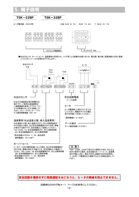 5.端子説明TSK-22BFTSK-32BFヒータ電流値(200V時)三相3kW8.7A5kW14.4A7.5kW21.7Aスプリング接続端子ネジサイズM5●吐出口センサ、オーバーヒート、温度異常の各端子は、ノイズ等による誤動作を避けるため、電力線、動力線、高調波線とは別に配線してください(シールド処理をおすすめします)。M4安全回路電源ページ5参照ヒータヒータ電源線(三相200V)を入力してください。電線のサイズは電圧降下を考慮して決定してください。(適用電線3.5~8㎜2)アース端子アース線を配線してください。吐出口センサ吐出口の温度検出用の熱電対の端子です。ご使用の温度調節計に補償導線を使用してプラス、マイナスを間違わないように配線してください。(K+→プラス、K-→マイナス適用補償導線WX-H)温度異常(吐出温度上限、吸入温度異常)吐出温度が上限、吸入温度が230℃、または周囲温度が65℃を超えた場合、及び安全回路電源がOFFの時、警報が発生する端子です。安全回路として確保してください。(AC:COM、1A:安全回路電源OFF、または異常時閉2A:安全回路電源OFF、または異常時開)(接点容量AC250V1.2A抵抗負荷適用電線0.75~2㎜2)オーバーヒートヒータケース内が異常高温になった場合、及び安全回路電源がOFFの時、警報が発生する端子です。安全回路として確保してください。(BC:COM、1B:安全回路電源OFF、または異常時閉2B:安全回路電源OFF、または異常時開)(接点容量AC250V1.2A抵抗負荷適用電線0.75~2㎜2)注意TSK-22BF、32BFで取り付け姿勢を下向き、または上向きで使用する場合、安全回路のオーバーヒート、温度異常が作動した時に、電圧引き外し装置付のNFBを使用して、必ずヒータ電源を永久遮断するように回路を設計してください。安全回路を確保せずに熱風運転をおこなうと、ヒータの断線を防止できません。回路例はカタログ№4-1ページ9を参考にしてください。-3-
