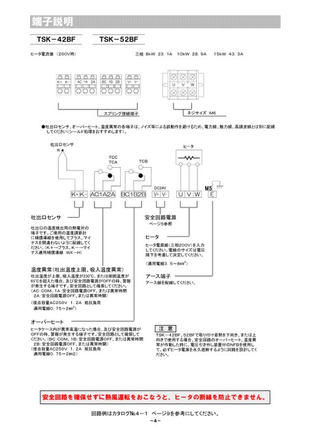 端子説明TSK-42BFTSK-52BFヒータ電流値(200V時)三相8kW23.1A10kW28.9A15kW43.3Aスプリング接続端子ネジサイズM6●吐出口センサ、オーバーヒート、温度異常の各端子は、ノイズ等による誤動作を避けるため、電力線、動力線、高調波線とは別に配線してください(シールド処理をおすすめします)。M5安全回路電源ページ5参照ヒータヒータ電源線(三相200V)を入力してください。電線のサイズは電圧降下を考慮して決定してください。(適用電線3.5~8㎜2)アース端子アース線を配線してください。吐出口センサ吐出口の温度検出用の熱電対の端子です。ご使用の温度調節計に補償導線を使用してプラス、マイナスを間違わないように配線してください。(K+→プラス、K-→マイナス適用補償導線WX-H)温度異常(吐出温度上限、吸入温度異常)吐出温度が上限、吸入温度が230℃、または周囲温度が65℃を超えた場合、及び安全回路電源がOFFの時、警報が発生する端子です。安全回路として確保してください。(AC:COM、1A:安全回路電源OFF、または異常時閉2A:安全回路電源OFF、または異常時開)(接点容量AC250V1.2A抵抗負荷適用電線0.75~2㎜2)オーバーヒートヒータケース内が異常高温になった場合、及び安全回路電源がOFFの時、警報が発生する端子です。安全回路として確保してください。(BC:COM、1B:安全回路電源OFF、または異常時閉2B:安全回路電源OFF、または異常時開)(接点容量AC250V1.2A抵抗負荷適用電線0.75~2㎜2)注意TSK-42BF、52BFで取り付け姿勢を下向き、または上向きで使用する場合、安全回路のオーバーヒート、温度異常が作動した時に、電圧引き外し装置付のNFBを使用して、必ずヒータ電源を永久遮断するように回路を設計してください。安全回路を確保せずに熱風運転をおこなうと、ヒータの断線を防止できません。回路例はカタログ№4-1ページ9を参考にしてください。-4-