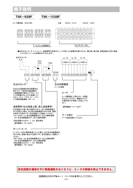 端子説明TSK-92BFTSK-102BFヒータ電流値(200V時)三相35kW101A45kW130Aスプリング接続端子ネジサイズM6●吐出口センサ、オーバーヒート、温度異常の各端子は、ノイズ等による誤動作を避けるため、電力線、動力線、高調波線とは別に配線してください(シールド処理をおすすめします)。M8吐出口センサ吐出口の温度検出用の熱電対の端子です。ご使用の温度調節計に補償導線を使用してプラス、マイナスを間違わないように配線してください。(K+→プラス、K-→マイナス適用補償導線WX-H)安全回路電源ページ5参照ヒータヒータ電源線(三相200V3回路)を入力してください。電線のサイズは電圧降下を考慮して決定してください。温度異常(吐出温度上限、吸入温度異常)(適用電線5.5~14㎜2)アース端子アース線を配線してください。吐出温度が上限、吸入温度が230℃、または周囲温度が65℃を超えた場合、及び安全回路電源がOFFの時、警報が発生する端子です。安全回路として確保してください。(AC:COM、1A:安全回路電源OFF、または異常時閉2A:安全回路電源OFF、または異常時開)(接点容量AC250V1.2A抵抗負荷適用電線0.75~2㎜2)オーバーヒートヒータケース内が異常高温になった場合、及び安全回路電源がOFFの時、警報が発生する端子です。安全回路として確保してください。(BC:COM、1B:安全回路電源OFF、または異常時閉2B:安全回路電源OFF、または異常時開)(接点容量AC250V1.2A抵抗負荷適用電線0.75~2㎜2)安全回路を確保せずに熱風運転をおこなうと、ヒータの断線を防止できません。回路例はカタログ№4-1ページ9を参考にしてください。-7-
