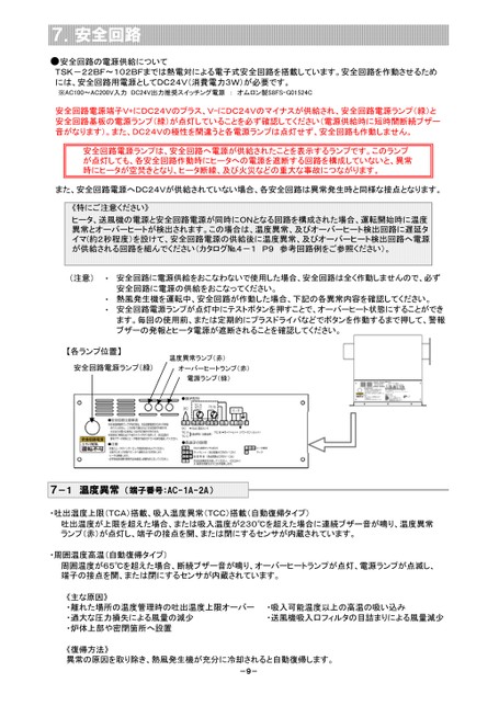 ●安全回路の電源供給についてTSK-22BF~102BFまでは熱電対による電子式安全回路を搭載しています。安全回路を作動させるためには、安全回路用電源としてDC24V(消費電力3W)が必要です。※AC100~AC200V入力DC24V出力推奨スイッチング電源:オムロン製S8FS-G01524C安全回路電源端子V+にDC24Vのプラス、V-にDC24Vのマイナスが供給され、安全回路電源ランプ(緑)と安全回路基板の電源ランプ(緑)が点灯していることを必ず確認してください(電源供給時に短時間断続ブザー音がなります)。また、DC24Vの極性を間違うと各電源ランプは点灯せず、安全回路も作動しません。安全回路電源ランプは、安全回路へ電源が供給されたことを表示するランプです。このランプが点灯しても、各安全回路作動時にヒータへの電源を遮断する回路を構成していないと、異常時にヒータが空焚きとなり、ヒータ断線、及び火災などの重大な事故につながります。また、安全回路電源へDC24Vが供給されていない場合、各安全回路は異常発生時と同様な接点となります。《特にご注意ください》ヒータ、送風機の電源と安全回路電源が同時にONとなる回路を構成された場合、運転開始時に温度異常とオーバーヒートが検出されます。この場合は、温度異常、及びオーバーヒート検出回路に遅延タイマ(約2秒程度)を設けて、安全回路電源の供給後に温度異常、及びオーバーヒート検出回路へ電源が供給される回路を組んでください(カタログ№4-1P9参考回路例をご参照ください)。安全回路に電源供給をおこなわないで使用した場合、安全回路は全く作動しませんので、必ず安全回路に電源の供給をおこなってください。熱風発生機を運転中、安全回路が作動した場合、下記の各異常内容を確認してください。安全回路電源ランプが点灯中にテストボタンを押すことで、オーバーヒート状態にすることができます。毎回の使用前、または定期的にプラスドライバなどでボタンを作動するまで押して、警報ブザーの発報とヒータ電源が遮断されることを確認してください。・・・(注意)7.安全回路【各ランプ位置】温度異常ランプ(赤)安全回路電源ランプ(緑)オーバーヒートランプ(赤)電源ランプ(緑)7-1温度異常(端子番号:AC-1A-2A)・吐出温度上限(TCA)搭載、吸入温度異常(TCC)搭載(自動復帰タイプ)吐出温度が上限を超えた場合、または吸入温度が230℃を超えた場合に連続ブザー音が鳴り、温度異常ランプ(赤)が点灯し、端子の接点を開、または閉にするセンサが内蔵されています。・周囲温度高温(自動復帰タイプ)周囲温度が65℃を超えた場合、断続ブザー音が鳴り、オーバーヒートランプが点灯、電源ランプが点滅し、端子の接点を開、または閉にするセンサが内蔵されています。《主な原因》・離れた場所の温度管理時の吐出温度上限オーバー・過大な圧力損失による風量の減少・炉体上部や密閉箇所へ設置・吸入可能温度以上の高温の吸い込み・送風機吸入口フィルタの目詰まりによる風量減少《復帰方法》異常の原因を取り除き、熱風発生機が充分に冷却されると自動復帰します。-9-