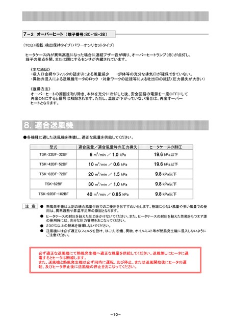 《主な原因》・吸入口金網やフィルタの詰まりによる風量減少・異物の混入による送風機モータのロック・炉体等の充分な排気口が確保できていない。・対象ワークの近接等による吐出口の抵抗(圧力損失が大きい)《復帰方法》オーバーヒートの原因を取り除き、本体を充分に冷却した後、安全回路の電源を一度OFFにして再度ONにすると信号は解除されます。ただし、温度が下がっていない場合は、再度オーバーヒートとなります。8.適合送風機●各機種に適した送風機を準備し、適正な風量を供給してください。型式適合風量/適合風量時の圧力損失ヒータケースの耐圧TSK-22BF・32BF6m3/min/1.0kPaTSK-42BF・52BF10m3/min/0.6kPaTSK-62BF・72BF20m3/min/1.5kPaTSK-82BF30m3/min/1.0kPaTSK-92BF・102BF40m3/min/0.85kPa19.6kPa以下19.6kPa以下9.8kPa以下9.8kPa以下9.8kPa以下ヒータケースの耐圧を超えた圧力をかけないでください。また、ヒータケースの耐圧を超えた性能をもつエア源の使用時には、充分な圧力管理をおこなってください。230℃以上の熱風を循環しないでください。送風機には必ず適正なフィルタを設け、ほこり、粉塵、異物、オイルミスト等が熱風発生機に混入しないようにご注意ください。●●●注意●熱風発生機は上記の適合風量付近でのご使用をおすすめいたします。極端に少ない風量や多い風量での使用は、異常過熱や昇温不足等の原因となります。必ず適正な送風機にて熱風発生機へ適正な風量を供給してください。送風無しにヒータに通電するとヒータは断線します。また、送風機と熱風発生機は必ず同時に運転、及び停止、または送風開始後にヒータの運転、及びヒータ停止後に送風機の停止をおこなってください。-10-7-2オーバーヒート(端子番号:BC-1B-2B)(TCB)搭載:検出保持タイプ(パワーオンリセットタイプ)ヒータケース内が異常高温になった場合に連続ブザー音が鳴り、オーバーヒートランプ(赤)が点灯し、端子の接点を開、または閉にするセンサが内蔵されています。
