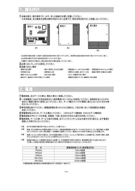 1.据え付け①本機は壁付、据付専用です。水平、または垂直の位置に設置してください。※本体底面、及び裏面の空間は機内冷却のために必要です。固定金具を取り外して設置しないでください。壁掛け壁掛け据え置き図1図2図3※出荷時の梱包を解いた状態では固定金具を内向きに取りつけています。ご使用時は固定金具を外向きに取りつけてください(図1)。※出荷時は壁付の方向に固定金具を取りつけています(図2)。※据置でご使用される場合は、固定金具の取付位置を変更してください(図3)。②必要に応じてしっかりと固定してください。③設置できない場所・振動のある場所・可燃物の付近・屋外で風雨にさらされる場所・周囲温度-5~+40℃以外の場所・周囲湿度85%R.H.以上の場所・発熱物の上部・密閉された部屋、及びケース内・裏面が壁等に密着される場所・標高1000m以上の場所・気圧の低い場所・ほこり、粉塵等の多い場所・酸性ガス、腐食性ガス等が浮遊している場所・通電性浮遊物(カーボン繊維等)のある場所2.電源①電源接続、及びアース工事は、電気工事士に依頼してください。②一次側電源には必ず正弦波波形をもつ商用電源(50/60Hz)を使用してください。高調波を含んだひずみ波をもつ電源は絶対に使用しないでください。また、サージ電圧やノイズが電源に侵入しないように充分対策をおこなってください。③専用回路を設けてください。漏電遮断器を取り付けられる場合は、下記の表に従って感度電流の容量を決定してください。④感電事故防止のため、アース工事をしてください。(300V以下:D種接地600V以下:C種接地)⑤電源接続はTRシリーズの前面、両側面、下面にある計5方向の入線穴を利用してください。⑥電源接続、アース工事、サービス端子の配線、及ディップスイッチによる出力端子の切り換えは、必ず電源を遮断した状態でおこなってください。注意注意注意注意長すぎる配線は電圧降下を起こしますので、ご注意ください。配線、及び点検時は必ず電源を遮断してください。自動温度調節器は本体ブレーカ(NFB)をOFFにしても、操作回路には通電されていますので、必ず工場元電源(一次側電源)を遮断してください。電源を入れた状態で作業をおこなうと感電します。接続にコンセントを設ける場合は、充分な容量を確保してください。コンセントが経年変化による接触不良、欠相等で発熱、故障することがあるので、なるべくコンセントの使用はひかえてください。熱風発生機は主に工業環境で使用される装置です。住宅環境等で使用する場合は、電波障害を発生する恐れがあります。その際、この製品の使用者は障害低減のために適切な手段を講じなければならないことがあります。型式TR32ATR52ATR82ATR102ATR152A漏電遮断器(ELB)感度電流目安50mA程度50mA程度100mA程度100mA程度200mA程度※漏電遮断器の感度電流は初期漏洩電流の約10倍程度が一般的です。-1-