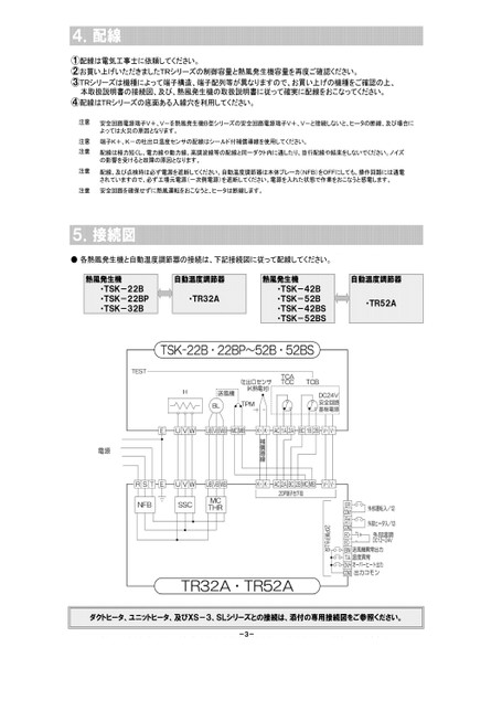 4.配線①配線は電気工事士に依頼してください。②お買い上げいただきましたTRシリーズの制御容量と熱風発生機容量を再度ご確認ください。③TRシリーズは機種によって端子構造、端子配列等が異なりますので、お買い上げの機種をご確認の上、本取扱説明書の接続図、及び、熱風発生機の取扱説明書に従って確実に配線をおこなってください。④配線はTRシリーズの底面ある入線穴を利用してください。注意注意注意注意安全回路電源端子V+、V-を熱風発生機B型シリーズの安全回路電源端子V+、V-と接続しないと、ヒータの断線、及び場合によっては火災の原因となります。端子K+、K-の吐出口温度センサの配線はシールド付補償導線を使用してください。配線は極力短くし、電力線や動力線、高調波線等の配線と同一ダクト内に通したり、並行配線や結束をしないでください。ノイズの影響を受けると故障の原因となります。配線、及び点検時は必ず電源を遮断してください。自動温度調節器は本体ブレーカ(NFB)をOFFにしても、操作回路には通電されていますので、必ず工場元電源(一次側電源)を遮断してください。電源を入れた状態で作業をおこなうと感電します。注意安全回路を確保せずに熱風運転をおこなうと、ヒータは断線します。5.接続図●各熱風発生機と自動温度調節器の接続は、下記接続図に従って配線してください。熱風発生機自動温度調節器熱風発生機自動温度調節器・TSK-22B・TSK-22BP・TSK-32B・TR32A・TSK-42B・TSK-52B・TSK-42BS・TSK-52BS・TR52Aダクトヒータ、ユニットヒータ、及びXS-3、SLシリーズとの接続は、添付の専用接続図をご参照ください。-3-