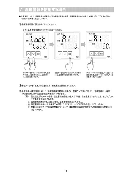7.温度警報を使用する場合●設定温度に対して、熱風温度が任意の一定の範囲を超えた場合、警報信号を出力できます。必要に応じてご利用ください(出荷時は無効に設定しています)。①温度警報範囲の設定をおこなってください。《例:温度警報範囲を±20℃に設定する場合》アップキーとダウンキーを同時に押し続けてください。指示部に『Lock』、設定部に『Loc2』が表示されます。設定キーを3回押してください。指示部に『A1』、設定部に『0』が表示されます。アップキーで『20』に設定してください。設定後は再度、設定キーを16回押して、元の表示に戻してください。設定温度が100℃の場合、温度警報範囲を20と入力すると、指示温度が120℃以上、及び80℃以下で温度警報が出力します。温度警報範囲を0と入力した場合、温度警報は出力されません。温度警報出力時は出力端子TAが閉になりますが、ヒータOFF等の保護はおこないません。警報は待機付き上下限偏差警報です。よって、運転開始後の設定温度までの昇温時には警報は出力されません。※※※〈例〉③指示温度が設定温度に対して、温度警報設定範囲を超えると、警報ランプ(赤)が点灯し、温度警報出力端子TAが閉になります(温度警報出力選択時:P13参照)。②運転スイッチを『熱風』の位置にして、熱風運転を開始してください。-6-