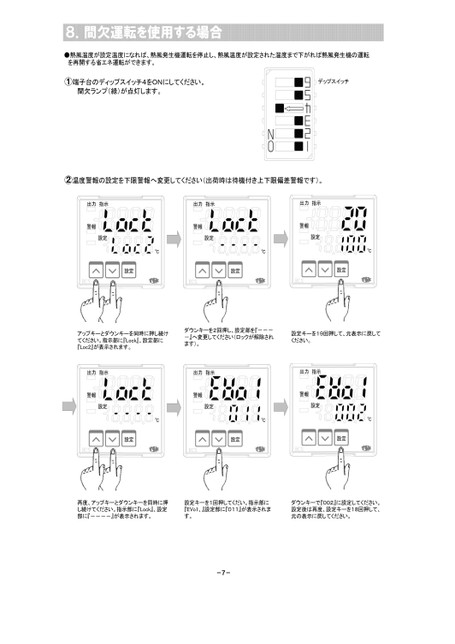 8.間欠運転を使用する場合●熱風温度が設定温度になれば、熱風発生機運転を停止し、熱風温度が設定された温度まで下がれば熱風発生機の運転を再開する省エネ運転ができます。①端子台のディップスイッチ4をONにしてください。間欠ランプ(緑)が点灯します。デップスイッチ②温度警報の設定を下限警報へ変更してください(出荷時は待機付き上下限偏差警報です)。アップキーとダウンキーを同時に押し続けてください。指示部に『Lock』、設定部に『Loc2』が表示されます。ダウンキーを2回押し、設定部を『----』へ変更してください(ロックが解除されます)。設定キーを19回押して、元表示に戻してください。再度、アップキーとダウンキーを同時に押し続けてください。指示部に『Lock』、設定部に『----』が表示されます。設定キーを1回押してくだい。指示部に『EVo1、』設定部に『011』が表示されます。ダウンキーで『002』に設定してください。設定後は再度、設定キーを18回押して、元の表示に戻してください。-7-