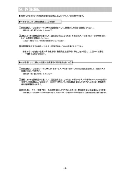 9.外部運転●外部からの信号によって熱風発生機の運転停止、及びヒータの入/切が操作できます。●外部信号によって熱風運転をおこなう場合①外部運転入/切端子ER-COM1の短絡板を外して、開閉の入力回路を接続してください。(接点出力端子電圧DC12V3.6mA以下)②運転スイッチを『熱風』の位置にして、温度設定をおこなった後、外部運転入/切端子ER-COM1を閉にして、外部運転を開始してください。(このとき、外部ヒータ入/切端子の短絡板は外さないでください。)③外部運転を終了する場合は外部入/切端子ER-COM1を開にしてください。※組み合わせた他の装置の異常停止時に熱風発生機を同時に停止したい場合は、上記の外部運転手順をおこなってください。●外部信号によって停止-送風-熱風運転の切り換えをおこなう場合①外部運転入/切端子ER-COM1と外部ヒータ入/切端子EH-COM2の短絡板を外して、開閉の入力回路を接続してください。(接点出力端子電圧DC12V3.6mA以下)②運転スイッチを『熱風』の位置にして、温度設定をおこなった後、外部ヒータ入/切端子EH-COM2を開の状態で、外部運転入/切端子ER-COM1を閉にして、外部運転を開始してください。このとき、熱風発生機は送風運転となります。③次に外部ヒータ入/切端子EH-COM2を閉にしてください。このとき、熱風発生機は熱風運転となります。(外部運転入/切端子ER-COM1が開の状態で、外部ヒータ入/切端子EH-COM2を閉にしても熱風発生機は運転できません。-9-
