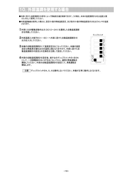 10.外部温調を使用する場合●外部に設けた温度調節計の信号によって熱風発生機を制御できます。この場合、本体の温度調節計は吐出温度上限リミッタとして使用してください。●外部温調機能を使用した場合は、設定SV値の熱風温度設定、及び指示SV値の熱風温度指示は吐出口センサの温度となります。①外部にSSR駆動逆動作出力(DC12~24V)を選択した自動温度調節計を用意してください。②外部温調入力端子EC+-EC-へ外部に設けた自動温度調節計の出力を入力してください。③本機の自動温度調節計にて温度設定をおこなってください。本機の温度設定は熱風発生機吐出口の温度上限となりますので、外部に設けた自動温度調節計の設定との互換性を注意して設定してください。④外部の自動温度調節計を設定後、端子台のディップスイッチの1をONにして、一次側電源のON/OFFをおこなってから、通常の熱風運転を開始してください。外部の自動温度調節計の設定にて、熱風運転を開始します。ディップスイッチ注意ディップスイッチの4、5、6は操作しないでください。本機が正常に動作しなくなります。-10-