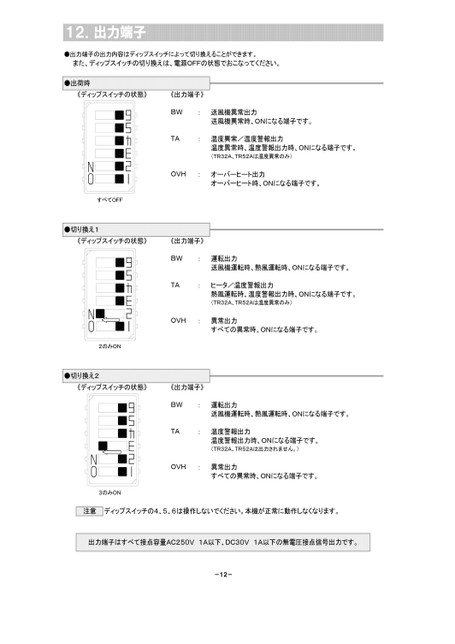 12.出力端子●出力端子の出力内容はディップスイッチによって切り換えることができます。また、ディップスイッチの切り換えは、電源OFFの状態でおこなってください。●出荷時《ディップスイッチの状態》《出力端子》BWTAOVH:::送風機異常出力送風機異常時、ONになる端子です。温度異常/温度警報出力温度異常時、温度警報出力時、ONになる端子です。(TR32A、TR52Aは温度異常のみ)オーバーヒート出力オーバーヒート時、ONになる端子です。すべてOFF●切り換え1《ディップスイッチの状態》《出力端子》BWTAOVH:::運転出力送風機運転時、熱風運転時、ONになる端子です。ヒータ/温度警報出力熱風運転時、温度警報出力時、ONになる端子です。(TR32A、TR52Aは温度異常のみ)異常出力すべての異常時、ONになる端子です。2のみON●切り換え2《ディップスイッチの状態》《出力端子》BWTAOVH:::運転出力送風機運転時、熱風運転時、ONになる端子です。温度警報出力温度警報出力時、ONになる端子です。(TR32A、TR52Aは出力されません。)異常出力すべての異常時、ONになる端子です。3のみON注意ディップスイッチの4、5、6は操作しないでください。本機が正常に動作しなくなります。出力端子はすべて接点容量AC250V1A以下、DC30V1A以下の無電圧接点信号出力です。-12-
