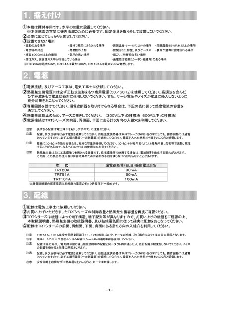 1.据え付け①本機は据付専用です。水平の位置に設置してください。※本体底面の空間は機内冷却のために必要です。固定金具を取り外して設置しないでください。②必要に応じてしっかりと固定してください。③設置できない場所・振動のある場所・可燃物の付近・屋外で風雨にさらされる場所・周囲温度-5~+40℃以外の場所・周囲湿度85%R.H.以上の場所・発熱物の上部・密閉された部屋、及びケース内・裏面が壁等に密着される場所・標高1000m以上の場所・気圧の低い場所・ほこり、粉塵等の多い場所・酸性ガス、腐食性ガス等が浮遊している場所・通電性浮遊物(カーボン繊維等)のある場所※TRT20Aは最大50W、TRT51Aは最大130W、TRT101Aは最大200W発熱します。2.電源①電源接続、及びアース工事は、電気工事士に依頼してください。②熱風発生機電源には必ず正弦波波形をもつ商用電源(50/60Hz)を使用してください。高調波を含んだひずみ波をもつ電源は絶対に使用しないでください。また、サージ電圧やノイズが電源に侵入しないように充分対策をおこなってください。③専用回路を設けてください。漏電遮断器を取り付けられる場合は、下記の表に従って感度電流の容量を決定してください。④感電事故防止のため、アース工事をしてください。(300V以下:D種接地600V以下:C種接地)⑤電源接続はTRTシリーズの前面、両側面、下面にある計5方向の入線穴を利用してください。注意注意注意注意長すぎる配線は電圧降下を起こしますので、ご注意ください。配線、及び点検時は必ず電源を遮断してください。自動温度調節器は本体ブレーカ(NFB)をOFFにしても、操作回路には通電されていますので、必ず工場元電源(一次側電源)を遮断してください。電源を入れた状態で作業をおこなうと感電します。接続にコンセントを設ける場合は、充分な容量を確保してください。コンセントが経年変化による接触不良、欠相等で発熱、故障することがあるので、なるべくコンセントの使用はひかえてください。熱風発生機は主に工業環境で使用される装置です。住宅環境等で使用する場合は、電波障害を発生する恐れがあります。その際、この製品の使用者は障害低減のために適切な手段を講じなければならないことがあります。型式TRT20ATRT51ATRT101A漏電遮断器(ELB)感度電流目安30mA50mA100mA※漏電遮断器の感度電流は初期漏洩電流の約10倍程度が一般的です。3.配線①配線は電気工事士に依頼してください。②お買い上げいただきましたTRTシリーズの制御容量と熱風発生機容量を再度ご確認ください。③TRTシリーズは機種によって端子構造、端子配列等が異なりますので、お買い上げの機種をご確認の上、本取扱説明書、熱風発生機の取扱説明書、及び結線電気図に従って確実に配線をおこなってください。④配線はTRTシリーズの前面、両側面、下面、背面にある計5方向の入線穴を利用してください。注意注意注意注意TRT51A、101Aは安全回路電源端子11、12を接続しないと、ヒータの断線、及び場合によっては火災の原因となります。端子1、2の吐出口温度センサの配線はシールド付補償導線を使用してください。配線は極力短くし、電力線や動力線、高調波線等の配線と同一ダクト内に通したり、並行配線や結束をしないでください。ノイズの影響を受けると故障の原因となります。配線、及び点検時は必ず電源を遮断してください。自動温度調節器は本体ブレーカ(NFB)をOFFにしても、操作回路には通電されていますので、必ず工場元電源(一次側電源)を遮断してください。電源を入れた状態で作業をおこなうと感電します。注意安全回路を確保せずに熱風運転をおこなうと、ヒータは断線します。-1-
