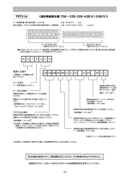 TRT51A《適合熱風発生機:TSK-22B・32B・42B(S)・52B(S)》ヒータ制御容量・最大負荷電流(200V時)三相15kW以下・50A適合送風機(マグネット仕様時の最大制御可能モータ電流値)三相130W・250W・750W(4A以下)ネジサイズM6(締め付けトルク:3.7N・m)ネジサイズM3.5(締め付けトルク:1.4N・m)●吐出口センサ、オーバーヒート、温度異常、送風機異常の各端子は、ノイズ等による誤動作を避けるため、電力線、動力線、高調波線とは別に配線してください(シールド処理をおすすめします)。RSTEUVWUBVBWBMCMBK+K-AC2ABC2BV+V-電源入力端子工場電源(一次側電源)を供給してください。アース端子アース線を配線してください。ヒータ出力端子熱風発生機のヒータ電源端子U・V・Wと接続してください。電線のサイズは電圧降下を考慮して決定してください。(適用電線TSK-21B・31B3.5~8㎜2、TSK-41B(S)・51B(S)8~22㎜2)ブロワ出力端子熱風発生機の送風機電源端子UB・VBWBと接続してください。電線のサイズは電圧降下を考慮して決定してください。(適用電線1.25~2㎜2)※お客様にて送風機をご用意される場合は、送風機の電源線を接続してください。ただし、ご注文時に当社にご指示いただいた送風機のみが接続可能となります。熱風発生機の安全回路電源端子V+・V-と接続してください。(適用電線1.25~2㎜2)熱風発生機のオーバーヒート端子BC・2Bと接続してください。(適用電線1.25~2㎜2)熱風発生機の温度異常端子AC・2Aと接続してください。(適用電線1.25~2㎜2)熱風発生機の吐出口センサ端子K+・K-と補償導線にてプラス、マイナスを間違わないように配線してください。(K+→プラス、K-→マイナス適用補償導線WX-H)熱風発生機の送風機異常端子MC・MBと接続してください。(適用電線1.25~2㎜2)※端子V+・V-は安全回路用端子です。※お客様にて送風機をご用意される場合、送風機異常端子MC・MBは短絡してください。安全回路を確保せずに、熱風運転をおこなうとヒータの断線の防止ができません。結線例はTSK-22B~52BSとTRT51Aの結線電気図を参考にしてください。-3-