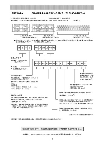 TRT101A《適合熱風発生機:TSK-62B(S)・72B(S)・82B(S)》ヒータ制御容量・最大負荷電流(200V時)適合送風機(マグネット仕様時の最大制御可能モータ電流値)三相三相30kW以下・50A×2回路750W・1500W・2200W(10A以下)ネジサイズM8ネジサイズM6(締め付けトルク:9N・m)(締め付けトルク:3.7N・m)ネジサイズM3.5(締め付けトルク:1.4N・m)●吐出口センサ、オーバーヒート、温度異常、送風機異常の各端子は、ノイズ等による誤動作を避けるため、電力線、動力線、高調波線とは別に配線してください(シールド処理をおすすめします)。RSTEU1V1W1U2V2W2電源入力端子工場電源(一次側電源)を供給してください。アース端子アース線を配線してください。UBVBWBMCMBK+K-AC2ABC2BV+V-ヒータ出力端子熱風発生機のヒータ電源端子U1・V1・W1、U2・V2・W2と接続してください。電線のサイズは電圧降下を考慮して決定してください。(適用電線TSK-61B(S)・71B(S)5.5~14㎜2、TSK-81B(S)8~22㎜2)ブロワ出力端子熱風発生機の送風機電源端子UB・VB・WBと接続してください。電線のサイズは電圧降下を考慮して決定してください。(適用電線1.25~2㎜2)※お客様にて送風機をご用意される場合は、送風機の電源線を接続してください。ただし、ご注文時に当社にご指示いただいた送風機のみが接続可能となります。熱風発生機の安全回路電源端子V+・V-と接続してください。(適用電線1.25~2㎜2)熱風発生機のオーバーヒート端子BC・2Bと接続してください。(適用電線1.25~2㎜2)熱風発生機の温度異常端子AC・2Aと接続してください。(適用電線1.25~2㎜2)熱風発生機の吐出口センサ端子K+・K-と補償導線にてプラス、マイナスを間違わないように配線してください。(K+→プラス、K-→マイナス適用補償導線WX-H)熱風発生機の送風機異常端子MC・MBと接続してください。(適用電線1.25~2㎜2)※端子V+・V-は安全回路用端子です。※お客様にて送風機をご用意される場合、送風機異常端子MC・MBは短絡してください。安全回路を確保せずに、熱風運転をおこなうとヒータの断線の防止ができません。結線例はTSK-62B~82BSとTRT101Aの結線電気図を参考にしてください。-4-