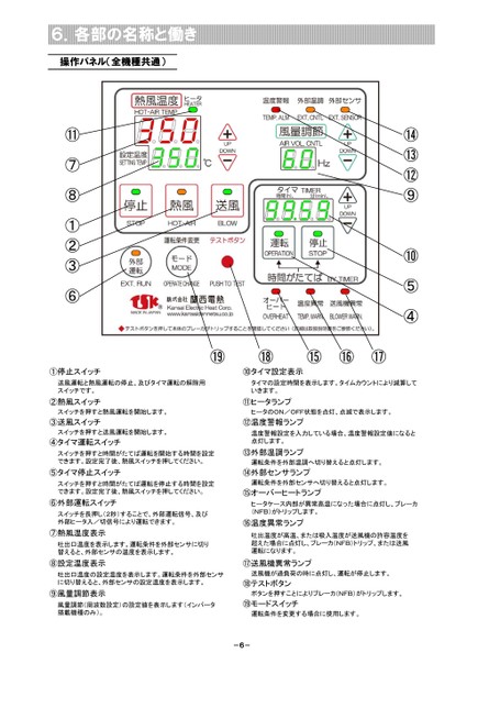 ⑭⑬⑫⑨⑩⑤④6.各部の名称と働き操作パネル(全機種共通)⑪⑦⑧①②③⑥⑲⑱⑮⑯⑰①停止スイッチ⑩タイマ設定表示送風運転と熱風運転の停止、及びタイマ運転の解除用スイッチです。タイマの設定時間を表示します。タイムカウントにより減算していきます。②熱風スイッチ⑪ヒータランプスイッチを押すと熱風運転を開始します。ヒータのON/OFF状態を点灯、点滅で表示します。③送風スイッチスイッチを押すと送風運転を開始します。④タイマ運転スイッチ⑫温度警報ランプ温度警報設定を入力している場合、温度警報設定値になると点灯します。スイッチを押すと時間がたてば運転を開始する時間を設定できます。設定完了後、熱風スイッチを押してください。⑬外部温調ランプ運転条件を外部温調へ切り替えると点灯します。⑤タイマ停止スイッチ⑭外部センサランプスイッチを押すと時間がたてば運転を停止する時間を設定できます。設定完了後、熱風スイッチを押してください。運転条件を外部センサへ切り替えると点灯します。⑮オーバーヒートランプ⑥外部運転スイッチスイッチを長押し(2秒)することで、外部運転信号、及び外部ヒータ入/切信号により運転できます。⑦熱風温度表示吐出口温度を表示します。運転条件を外部センサに切り替えると、外部センサの温度を表示します。⑧設定温度表示吐出口温度の設定温度を表示します。運転条件を外部センサに切り替えると、外部センサの設定温度を表示します。⑨風量調節表示ヒータケース内部が異常高温になった場合に点灯し、ブレーカ(NFB)がトリップします。⑯温度異常ランプ吐出温度が高温、または吸入温度が送風機の許容温度を超えた場合に点灯し、ブレーカ(NFB)トリップ、または送風運転になります。⑰送風機異常ランプ送風機が過負荷の時に点灯し、運転が停止します。⑱テストボタンボタンを押すことによりブレーカ(NFB)がトリップします。風量調節(周波数設定)の設定値を表示します(インバータ搭載機種のみ)。⑲モードスイッチ運転条件を変更する場合に使用します。-6-