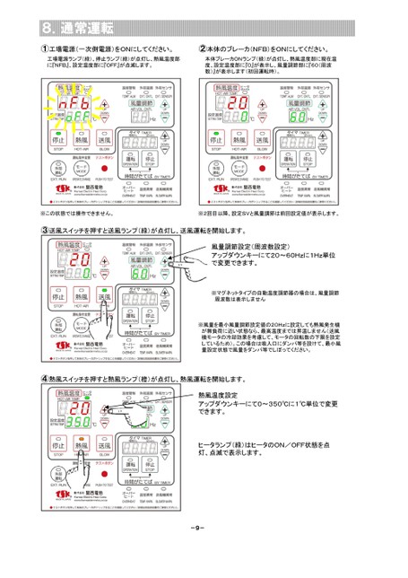 8.通常運転①工場電源(一次側電源)をONにしてください。②本体のブレーカ(NFB)をONにしてください。工場電源ランプ(緑)、停止ランプ(緑)が点灯し、熱風温度部に『NFB』、設定温度部に『OFF』が点滅します。本体ブレーカONランプ(緑)が点灯し、熱風温度部に現在温度、設定温度部に『0』が表示し、風量調節部に『60(周波数)』が表示します(初回運転時)。※この状態では操作できません。※2回目以降、設定SVと風量調節は前回設定値が表示します。③送風スイッチを押すと送風ランプ(緑)が点灯し、送風運転を開始します。風量調節設定(周波数設定)アップダウンキーにて20~60Hzに1Hz単位で変更できます。※マグネットタイプの自動温度調節器の場合は、風量調節周波数は表示しません※風量を最小風量調節設定値の20Hzに設定しても熱風発生機が無負荷に近い状態なら、最高温度までは昇温しません(送風機モータの冷却効果を考慮して、モータの回転数の下限を設定しているため)。この場合は吸入口にダンパ等を設けて、最小風量設定状態で風量をダンパ等でしぼってください。④熱風スイッチを押すと熱風ランプ(橙)が点灯し、熱風運転を開始します。熱風温度設定アップダウンキーにて0~350℃に1℃単位で変更できます。ヒータランプ(緑)はヒータのON/OFF状態を点灯、点滅で表示します。-9-