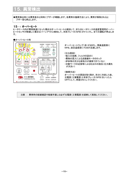 15.異常検出◆異常検出時には異常表示と同時にブザーが鳴動します。各異常の復帰方法により、異常が解除されるとブザー音も停止します。15-1オーバーヒートヒータケース内が異常高温になった場合はオーバーヒートと検知して、またはヒータケース内温度管理用オーバーヒートセンサが断線した場合はバーンアウトと検知して、本体ブレーカ(NFB)がトリップし、全ての運転が停止します。●オーバーヒート時オーバーヒートランプ(赤)が点灯し、熱風温度部にNFB、設定温度部にTCBが点滅します。《主な原因》・吸入口金網、フィルタの詰まり・異物の混入による送風機モータのロック・炉体等の充分な排気口が確保できていない・対象ワークの近接等による吐出口の抵抗(圧力損失が大きい)《復帰方法》オーバーヒートの原因を取り除き、充分に冷却した後、元電源(工場電源)と本体ブレーカ(NFB)をいったんOFFにして、再度ONにしてください。注意:異常時の配線確認や配線手直しは必ず元電源(工場電源)を遮断して実施してください。-15-