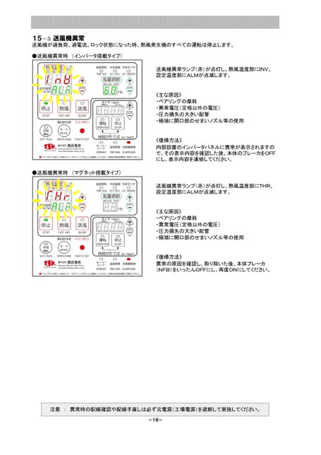 15-3送風機異常送風機が過負荷、過電流、ロック状態になった時、熱風発生機のすべての運転は停止します。●送風機異常時(インバータ搭載タイプ)●送風機異常時(マグネット搭載タイプ)送風機異常ランプ(赤)が点灯し、熱風温度部にINV、設定温度部にALMが点滅します。《主な原因》・ベアリングの摩耗・異常電圧(定格以外の電圧)・圧力損失の大きい配管・極端に開口部のせまいノズル等の使用《復帰方法》内部設置のインバータパネルに異常が表示されますので、その表示内容を確認した後、本体のブレーカをOFFにし、表示内容を連絡してください。送風機異常ランプ(赤)が点灯し、熱風温度部にTHR、設定温度部にALMが点滅します。《主な原因》・ベアリングの摩耗・異常電圧(定格以外の電圧)・圧力損失の大きい配管・極端に開口部のせまいノズル等の使用《復帰方法》異常の原因を確認し、取り除いた後、本体ブレーカ(NFB)をいったんOFFにし、再度ONにしてください。注意:異常時の配線確認や配線手直しは必ず元電源(工場電源)を遮断して実施してください。-18-