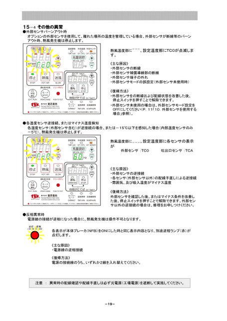 15-4その他の異常●外部センサバーンアウト時オプションの外部センサを使用して、離れた場所の温度を管理している場合、外部センサが断線等のバーンアウト時、熱風発生機は停止します。熱風温度部に---、設定温度部にTC0が点滅します。《主な原因》・外部センサの断線・外部センサ補償導線部の断線・外部センサ端子の外れ・外部センサモードの誤設定(外部センサ未使用時)《復帰方法》・外部センサをの断線および配線状態を改善した後、停止スイッチを押すことで解除できます。・外部センサ未使用の場合は、外部センサモード設定をOFFにしてください(P.11「10.外部センサを使用する場合」参照)。●各温度センサ逆接続、またはマイナス温度検知各温度センサ(外部センサ含む)が逆接続の場合、または-15℃以下を感知した場合(内部温度センサのみ-5℃)、熱風発生機は停止します。熱風温度部に---、設定温度部に各センサの表示が外部センサ:TC0吐出口センサ:TCA《主な原因》・外部センサの逆接続・各センサ(外部センサ以外)の配線手直しによる逆接続・雰囲気、及び吸入温度がマイナス温度《復帰方法》外部センサを確認した後、またはマイナス条件を改善した後、停止スイッチを押すことで解除できます。外部センサ以外の逆接続の場合は、修理をお申しつけください。●反相異常時電源線の接続が逆相になった場合に、熱風発生機は操作不可となります。各表示が本体ブレーカ(NFB)をONにした時と同じ表示内容となり、別途逆相ランプ(赤)が点灯します。《主な原因》・電源線の逆相接続《復帰方法》電源の接続線のうち、いずれか2線を入れ替えてください。注意:異常時の配線確認や配線手直しは必ず元電源(工場電源)を遮断して実施してください。-19-