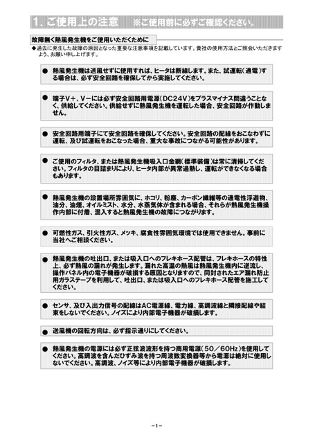 1.ご使用上の注意※ご使用前に必ずご確認ください。故障無く熱風発生機をご使用いただくために◆過去に発生した故障の原因となった重要な注意事項を記載しています。貴社の使用方法とご照会いただきますよう、お願い申し上げます。●熱風発生機は送風せずに使用すれば、ヒータは断線します。また、試運転(通電)する場合は、必ず安全回路を確保してから実施してください。●端子V+、V-には必ず安全回路用電源(DC24V)をプラスマイナス間違うことなく、供給してください。供給せずに熱風発生機を運転した場合、安全回路が作動しません。●安全回路用端子にて安全回路を確保してください。安全回路の配線をおこなわずに運転、及び試運転をおこなった場合、重大な事故につながる可能性があります。●●ご使用のフィルタ、または熱風発生機吸入口金網(標準装備)は常に清掃してください。フィルタの目詰まりにより、ヒータ内部が異常過熱し、運転ができなくなる場合もあります。熱風発生機の設置場所雰囲気に、ホコリ、粉塵、カーボン繊維等の通電性浮遊物、油分、油煙、オイルミスト、水分、水蒸気体が含まれる場合、それらが熱風発生機操作内部に付着、混入すると熱風発生機の故障につながります。●可燃性ガス、引火性ガス、メッキ、腐食性雰囲気環境では使用できません。事前に当社へご相談ください。●熱風発生機の吐出口、または吸入口へのフレキホース配管は、フレキホースの特性上、必ず熱風の漏れが発生します。漏れた高温の熱風は熱風発生機内に逆流し、操作パネル内の電子機器が破損する原因となりますので、同封されたエア漏れ防止用ガラステープを利用して、吐出口、または吸入口へのフレキホース配管を施工してください。●センサ、及び入出力信号の配線はAC電源線、電力線、高調波線と隣接配線や結束をしないでください。ノイズにより内部電子機器が破損します。●●送風機の回転方向は、必ず指示通りにしてください。熱風発生機の電源には必ず正弦波波形を持つ商用電源(50/60Hz)を使用してください。高調波を含んだひずみ波を持つ周波数変換器等から電源は絶対に使用しないでください。高調波、ノイズ等により内部電子機器が破損します。-1-