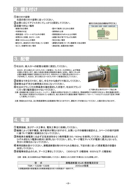 2.据え付け①取り付け姿勢右図の取り付け姿勢に従ってください。②必要に応じてアジャスタにてしっかりと固定してください。③設置できない場所・振動のある場所・可燃物の付近・屋外で風雨にさらされる場所・発熱物の上部・周囲温度-5℃~+40℃以外の場所・周囲湿度85%R.H.以上の場所・密閉された部屋、及びケース内・金属片等が落下するような場所・標高1000m以上の場所・気圧の低い場所・酸性ガス、腐食性ガス等が浮遊している場所・通電性浮遊物(カーボン繊維等)のある場所・ほこり、粉塵等の多い場所・凍結状態、結露状態の場所3.配管①吐出口、吸入口への配管は確実に固定してください。吐出口、または吸入口へのフレキホース配管は、フレキホースの特性上、必ず熱風の漏れが発生します。漏れた高温の熱風は熱風発生機内に逆流し、操作パネル内の電子機器が破損する原因となりますので、同封されたエア漏れ防止用ガラステープを利用して、吐出口、または吸入口へのフレキホース配管を施工してください。②配管はできるだけ太く、短く、ゆるやかな曲がりで施工してください。③配管は必ず充分な断熱施工をおこなってください。④吐出口フランジ付の熱風発生機を固定した状態で、吐出口フランジに引っ張り偏荷重をかけないでください。注意:送風機の吸入気体にトルエン、シンナー、多量の水蒸気が含まれている場合は、熱風循環式では使用できません(熱交換器を使用)。吸入気体に可燃性ガスが含まれている場合は、吸入気体のガス濃度を爆発下限界の1/50~1/100以下になるまで空気で希釈して使用してください。エア漏れ防止用ガラステープ施工例注意:熱風吐出口付近、及び熱風循環時は送風機部が熱くなりますので、運転中に手を触れないでください。火傷の恐れがあります。4.電源①電源接続、及びアース工事は、電気工事士に依頼してください。②機種によって端子構造、端子配列が異なりますので、お買い上げの機種を確認の上、3ページの端子説明に基づいて確実に配線をおこなってください。③熱風発生機電源には必ず正弦波波形をもつ商用電源(50/60Hz)を使用してください。高調波を含んだひずみ波をもつ電源は絶対に使用しないでください。また、サージ電圧やノイズが電源に侵入しないよう、充分に対策をおこなってください。④専用回路を設けてください。漏電遮断器を取り付けられる場合は、下記の表に従って感度電流の容量を決定してください。⑤感電事故防止のため、アース工事をしてください。(300V以下:D種接地600V以下:C種接地)注意:配線、及び点検時は必ず電源を遮断してください。電源を入れた状態で作業をおこなうと感電します。型式TSK-122B・132B漏電遮断器(ELB)感度電流目安200mA程度※漏電遮断器の感度電流は初期漏洩電流の約10倍程度が一般的です。-2-