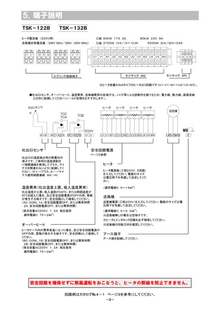 5.端子説明TSK-122BTSK-132Bヒータ電流値(200V時)三相60kW173.2A80kW230.9A送風機定格電流値(200V50Hz/200V・220V60Hz)三相3700W15.0/14.1・13.3A5500W22.9/20.9・19.6Aスプリング接続端子ネジサイズM6ネジサイズM4※ヒータ容量60kWタイプのヒータは3回路です(U1・V1・W1~U3・V3・W3)。●吐出口センサ、オーバーヒート、温度異常、送風機異常の各端子は、ノイズ等による誤動作を避けるため、電力線、動力線、高調波線とは別に配線してください(シールド処理をおすすめします)。M8吐出口センサ吐出口の温度検出用の熱電対の端子です。ご使用の温度調節計に補償導線を使用してプラス、マイナスを間違わないように配線してください。(K+→プラス、K-→マイナス適用補償導線WX-H)安全回路電源ページ5参照ヒータヒータ電源線(三相200V2回路)を入力してください。電線のサイズは電圧降下を考慮して決定してください。温度異常(吐出温度上限、吸入温度異常)(適用電線5.5~14㎜2)吐出温度が上限、吸入温度が230℃、または周囲温度が65℃を超えた場合、及び安全回路電源がOFFの時、警報が発生する端子です。安全回路として確保してください。(AC:COM、1A:安全回路電源OFF、または異常時閉2A:安全回路電源OFF、または異常時開)(接点容量AC250V1.2A抵抗負荷適用電線0.75~2㎜2)オーバーヒートヒータケース内が異常高温になった場合、及び安全回路電源がOFFの時、警報が発生する端子です。安全回路として確保してください。(BC:COM、1B:安全回路電源OFF、または異常時閉2B:安全回路電源OFF、または異常時開)(接点容量AC250V1.2A抵抗負荷適用電線0.75~2㎜2)送風機送風機電源(三相200V)を入力してください。電線のサイズは電圧降下を考慮して決定してください。(適用電線3.5~5.5㎜2)※送風機無しの場合は空端子です。※ヒータとインタロック回路を必ず確保してください。※送風機の回転方向を確認してください。アース端子アース線を配線してください。安全回路を確保せずに熱風運転をおこなうと、ヒータの断線を防止できません。回路例はカタログ№4-1ページ9を参考にしてください。-3-