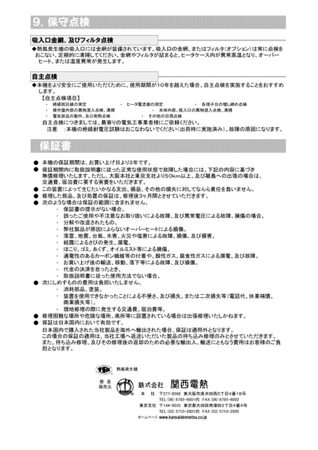 ◆熱風発生機の吸入口には金網が装備されています。吸入口の金網、またはフィルタ(オプション)は常に点検をおこない、定期的に清掃してください。金網やフィルタが詰まると、ヒータケース内が異常高温となり、オーバーヒート、または温度異常が発生します。自主点検◆本機をより安全にご使用いただくために、使用期間が10年を越えた場合、自主点検を実施することをおすすめします。【自主点検項目】・・・絶縁抵抗値の測定・ヒータ電流値の測定・各端子台の増し締め点検操作盤内部の異物混入点検、清掃電気部品の動作、及び発熱点検・本体内部、吸入口の異物混入点検、清掃・その他の目視点検自主点検につきましては、最寄りの電気工事業者様にご依頼ください。注意:本機の絶縁耐電圧試験はおこなわないでください(出荷時に実施済み)。故障の原因になります。保証書・・・・・・・・・・・保証書の提示がない場合。誤ったご使用や不注意なお取り扱いによる故障、及び異常電圧による故障、損傷の場合。分解や改造されたもの。弊社製品が原因によらないオーバーヒートによる損傷。落雷、地震、台風、水害、火災や塩害による故障、損傷、及び損害。結露によるさびの発生、漏電。ほこり、ゴミ、糸くず、オイルミスト等による損傷。通電性のあるカーボン繊維等の付着や、酸性ガス、腐食性ガスによる漏電、及び故障。お買い上げ後の輸送、移動、落下等による故障、及び損傷。代金の決済を怠ったとき。取扱説明書に従った使用方法でない場合。本機の保証期間は、お買い上げ日より3年です。保証期間内に取扱説明書に従った正常な使用状態で故障した場合には、下記の内容に基づき無償修理いたします。ただし、大阪本社と東京支社より50km以上、及び離島への出張の場合は、交通費、宿泊費に要する実費をいただきます。この装置によって生じたいかなる支出、損益、その他の損失に対してなんら責任を負いません。修理した部品、及び処置の保証は、修理後3ヶ月間とさせていただきます。次のような場合は保証の範囲に含まれません。●●●●●・・・消耗部品、塗装。装置を使用できなかったことによる不便さ、及び損失、または二次損失等(電話代、休業補償、商業損失等)。現地修理の際に発生する交通費、宿泊費等。日本国内で購入された当社製品を海外へ輸出された場合、保証は適用外となります。この場合の保証の適用は、当社工場へ返送いただいた製品の持ち込み修理のみとさせていただきます。また、持ち込み修理、及びその修理後の返却のための必要な輸出入、輸送にともなう費用はお客様のご負担となります。修理困難な場所や危険な場所、高所等に設置されている場合は出張修理いたしかねます。保証は日本国内において有効です。●●●次にしめすものの費用は負担いたしません。9.保守点検吸入口金網、及びフィルタ点検熱風発生機製造販売元株式会社関西電熱本社〒577-8566東大阪市高井田西5丁目4番18号TEL(06)6785-6001㈹FAX(06)6785-6002東京支社〒144-0035東京都大田区南蒲田2丁目4番4号TEL(03)5710-2001㈹FAX(03)5710-2005ホームページwww.kansaidennetsu.co.jp