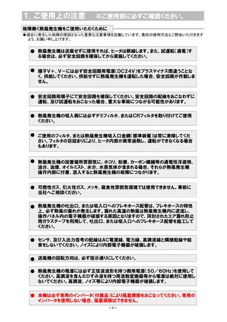1.ご使用上の注意※ご使用前に必ずご確認ください。故障無く熱風発生機をご使用いただくために◆過去に発生した故障の原因となった重要な注意事項を記載しています。貴社の使用方法とご照会いただきますよう、お願い申し上げます。●熱風発生機は送風せずに使用すれば、ヒータは断線します。また、試運転(通電)する場合は、必ず安全回路を確保してから実施してください。●端子V+、V-には必ず安全回路用電源(DC24V)をプラスマイナス間違うことなく、供給してください。供給せずに熱風発生機を運転した場合、安全回路が作動しません。●安全回路用端子にて安全回路を確保してください。安全回路の配線をおこなわずに運転、及び試運転をおこなった場合、重大な事故につながる可能性があります。●熱風発生機の吸入側には必ずデミフィルタ、またはCRフィルタを取り付けてご使用ください。●●ご使用のフィルタ、または熱風発生機吸入口金網(標準装備)は常に清掃してください。フィルタの目詰まりにより、ヒータ内部が異常過熱し、運転ができなくなる場合もあります。熱風発生機の設置場所雰囲気に、ホコリ、粉塵、カーボン繊維等の通電性浮遊物、油分、油煙、オイルミスト、水分、水蒸気体が含まれる場合、それらが熱風発生機操作内部に付着、混入すると熱風発生機の故障につながります。●可燃性ガス、引火性ガス、メッキ、腐食性雰囲気環境では使用できません。事前に当社へご相談ください。●熱風発生機の吐出口、または吸入口へのフレキホース配管は、フレキホースの特性上、必ず熱風の漏れが発生します。漏れた高温の熱風は熱風発生機内に逆流し、操作パネル内の電子機器が破損する原因となりますので、同封されたエア漏れ防止用ガラステープを利用して、吐出口、または吸入口へのフレキホース配管を施工してください。●センサ、及び入出力信号の配線はAC電源線、電力線、高調波線と隣接配線や結束をしないでください。ノイズにより内部電子機器が破損します。●●送風機の回転方向は、必ず指示通りにしてください。熱風発生機の電源には必ず正弦波波形を持つ商用電源(50/60Hz)を使用してください。高調波を含んだひずみ波を持つ周波数変換器等から電源は絶対に使用しないでください。高調波、ノイズ等により内部電子機器が破損します。●本機は必ず専用のインバータ(付属品)により風量調節をおこなってください。専用のインバータを使用しない場合、風量調節はできません。-1-