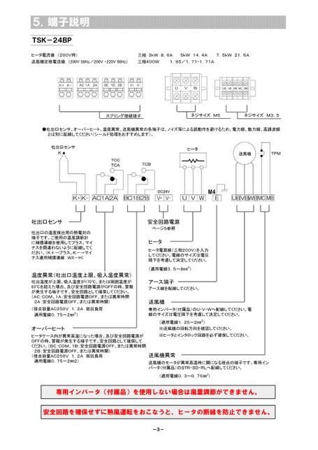 5.端子説明TSK-24BPヒータ電流値(200V時)三相3kW8.6A5kW14.4A7.5kW21.6A送風機定格電流値(200V50Hz/200V・220V60Hz)三相400W1.95/1.71・1.71Aスプリング接続端子ネジサイズM5ネジサイズM3.5●吐出口センサ、オーバーヒート、温度異常、送風機異常の各端子は、ノイズ等による誤動作を避けるため、電力線、動力線、高調波線とは別に配線してください(シールド処理をおすすめします)。吐出口センサ吐出口の温度検出用の熱電対の端子です。ご使用の温度調節計に補償導線を使用してプラス、マイナスを間違わないように配線してください。(K+→プラス、K-→マイナス適用補償導線WX-H)温度異常(吐出口温度上限、吸入温度異常)吐出温度が上限、吸入温度が170℃、または周囲温度が65℃を超えた場合、及び安全回路電源がOFFの時、警報が発生する端子です。安全回路として確保してください。(AC:COM、1A:安全回路電源OFF、または異常時閉2A:安全回路電源OFF、または異常時開)(接点容量AC250V1.2A抵抗負荷適用電線0.75~2㎜2)オーバーヒートヒータケース内が異常高温になった場合、及び安全回路電源がOFFの時、警報が発生する端子です。安全回路として確保してください。(BC:COM、1B:安全回路電源OFF、または異常時閉2B:安全回路電源OFF、または異常時開)(接点容量AC250V1.2A抵抗負荷適用電線0.75~2㎜2)M4安全回路電源ページ5参照ヒータヒータ電源線(三相200V)を入力してください。電線のサイズは電圧降下を考慮して決定してください。(適用電線3.5~8㎜2)アース端子アース線を配線してください。送風機専用インバータ(付属品)のU・V・Wへ配線してください。電線のサイズは電圧降下を考慮して決定してください。(適用電線1.25~2㎜2)※送風機の回転方向を確認してください。※ヒータとインタロック回路を必ず確保してください。送風機異常送風機のモータが異常高温時に開になる接点の端子です。専用インバータ(付属品)のSTR・SD・RLへ配線してください。(適用電線0.3~0.75㎜2)専用インバータ(付属品)を使用しない場合は風量調節ができません。安全回路を確保せずに熱風運転をおこなうと、ヒータの断線を防止できません。-3-
