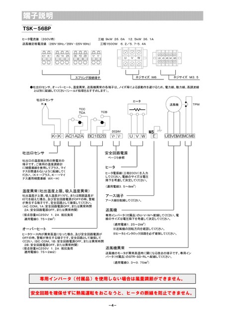 端子説明TSK-56BPヒータ電流値(200V時)三相9kW26.0A12.5kW36.1A送風機定格電流値(200V50Hz/200V・220V60Hz)三相1500W6.2/5.7・5.4Aスプリング接続端子ネジサイズM6ネジサイズM3.5●吐出口センサ、オーバーヒート、温度異常、送風機異常の各端子は、ノイズ等による誤動作を避けるため、電力線、動力線、高調波線とは別に配線してください(シールド処理をおすすめします)。吐出口センサ吐出口の温度検出用の熱電対の端子です。ご使用の温度調節計に補償導線を使用してプラス、マイナスを間違わないように配線してください。(K+→プラス、K-→マイナス適用補償導線WX-H)温度異常(吐出温度上限、吸入温度異常)吐出温度が上限、吸入温度が170℃、または周囲温度が65℃を超えた場合、及び安全回路電源がOFFの時、警報が発生する端子です。安全回路として確保してください。(AC:COM、1A:安全回路電源OFF、または異常時閉2A:安全回路電源OFF、または異常時開)(接点容量AC250V1.2A抵抗負荷適用電線0.75~2㎜2)オーバーヒートヒータケース内が異常高温になった場合、及び安全回路電源がOFFの時、警報が発生する端子です。安全回路として確保してください。(BC:COM、1B:安全回路電源OFF、または異常時閉2B:安全回路電源OFF、または異常時開)(接点容量AC250V1.2A抵抗負荷適用電線0.75~2㎜2)M5安全回路電源ページ5参照ヒータヒータ電源線(三相200V)を入力してください。電線のサイズは電圧降下を考慮して決定してください。(適用電線3.5~8㎜2)アース端子アース線を配線してください。送風機専用インバータ(付属品)のU・V・Wへ配線してください。電線のサイズは電圧降下を考慮して決定してください。(適用電線1.25~2㎜2)※送風機の回転方向を確認してください。※ヒータとインタロック回路を必ず確保してください。送風機異常送風機のモータが異常高温時に開になる接点の端子です。専用インバータ(付属品)のSTR・SD・RLへ配線してください。(適用電線0.3~0.75㎜2)専用インバータ(付属品)を使用しない場合は風量調節ができません。安全回路を確保せずに熱風運転をおこなうと、ヒータの断線を防止できません。-4-