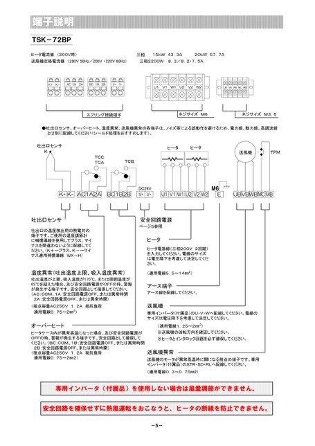 端子説明TSK-72BPヒータ電流値(200V時)三相15kW43.3A20kW57.7A送風機定格電流値(200V50Hz/200V・220V60Hz)三相2200W8.3/8.2・7.5Aスプリング接続端子ネジサイズM6ネジサイズM3.5●吐出口センサ、オーバーヒート、温度異常、送風機異常の各端子は、ノイズ等による誤動作を避けるため、電力線、動力線、高調波線とは別に配線してください(シールド処理をおすすめします)。M6吐出口センサ吐出口の温度検出用の熱電対の端子です。ご使用の温度調節計に補償導線を使用してプラス、マイナスを間違わないように配線してください。(K+→プラス、K-→マイナス適用補償導線WX-H)安全回路電源ページ5参照ヒータヒータ電源線(三相200V2回路)を入力してください。電線のサイズは電圧降下を考慮して決定してください。温度異常(吐出温度上限、吸入温度異常)(適用電線5.5~14㎜2)吐出温度が上限、吸入温度が170℃、または周囲温度が65℃を超えた場合、及び安全回路電源がOFFの時、警報が発生する端子です。安全回路として確保してください。(AC:COM、1A:安全回路電源OFF、または異常時閉2A:安全回路電源OFF、または異常時開)(接点容量AC250V1.2A抵抗負荷適用電線0.75~2㎜2)オーバーヒートヒータケース内が異常高温になった場合、及び安全回路電源がOFFの時、警報が発生する端子です。安全回路として確保してください。(BC:COM、1B:安全回路電源OFF、または異常時閉2B:安全回路電源OFF、または異常時開)(接点容量AC250V1.2A抵抗負荷適用電線0.75~2㎜2)アース端子アース線を配線してください。送風機専用インバータ(付属品)のU・V・Wへ配線してください。電線のサイズは電圧降下を考慮して決定してください。(適用電線1.25~2㎜2)※送風機の回転方向を確認してください。※ヒータとインタロック回路を必ず確保してください。送風機異常送風機のモータが異常高温時に開になる接点の端子です。専用インバータ(付属品)のSTR・SD・RLへ配線してください。(適用電線0.3~0.75㎜2)専用インバータ(付属品)を使用しない場合は風量調節ができません。安全回路を確保せずに熱風運転をおこなうと、ヒータの断線を防止できません。-5-
