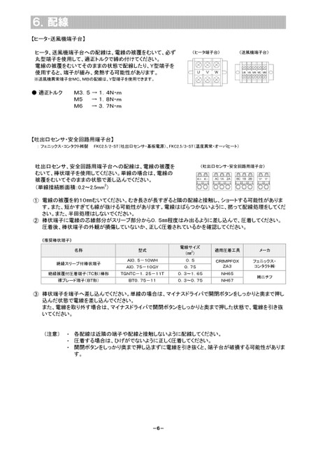 6.配線【ヒータ・送風機端子台】ヒータ、送風機端子台への配線は、電線の被覆をむいて、必ず丸型端子を使用して、適正トルクで締め付けてください。電線の被覆をむいてそのままの状態で配線したり、Y型端子を使用すると、端子が緩み、発熱する可能性があります。※送風機異常端子台MC、MBの配線は、Y型端子を使用できます。●適正トルクM3.5→1.4N・mM5→1.8N・mM6→3.7N・m〈ヒータ端子台〉〈送風機端子台〉吐出口センサ、安全回路用端子台への配線は、電線の被覆をむいて、棒状端子を使用してください。単線の場合は、電線の被覆をむいてそのままの状態で差し込んでください。(単線接続断面積:0.2~2.5mm2)〈吐出口センサ・安全回路用端子台〉①②電線の被覆を約10㎜むいてください。むき長さが長すぎると隣の配線と接触し、ショートする可能性があります。また、短かすぎても線が抜ける可能性があります。電線はばらつかないように、撚って配線処理をしてください。また、半田処理はしないでください。棒状端子に電線の芯線部分がスリーブ部分から0.5㎜程度はみ出るように差し込んで、圧着してください。圧着後、棒状端子の外観が損傷していないか、正しく圧着されているかを確認してください。《推奨棒状端子》名称型式絶縁スリーブ付棒状端子AI0.5-10WHAI0.75-10GY電線サイズ(㎜2)0.50.75絶縁被覆付圧着端子(TC形)棒形TGNTC-1.25-11T0.3~1.65裸ブレード端子(BT形)BT0.75-110.3~0.75適用圧着工具メーカCRIMPFOXZA3NH65NH67フェニックス・コンタクト㈱㈱ニチフ③棒状端子を端子へ差し込んでください。単線の場合は、マイナスドライバで開閉ボタンをしっかりと奥まで押し込んだ状態で電線を差し込んでください。また、電線を取り外す場合は、マイナスドライバで開閉ボタンをしっかりと奥まで押した状態で、電線を引き抜いてください。各配線は近隣の端子や配線と接触しないように配線してください。圧着する場合は、ひげがでないように正しく圧着してください。開閉ボタンをしっかり奥まで押し込まずに電線を引き抜くと、端子台が破損する可能性があります。・・・(注意)【吐出口センサ・安全回路用端子台】:フェニックス・コンタクト㈱製FKC2.5/2-ST(吐出口センサ・基板電源)、FKC2.5/3-ST(温度異常・オーバヒート)-6-