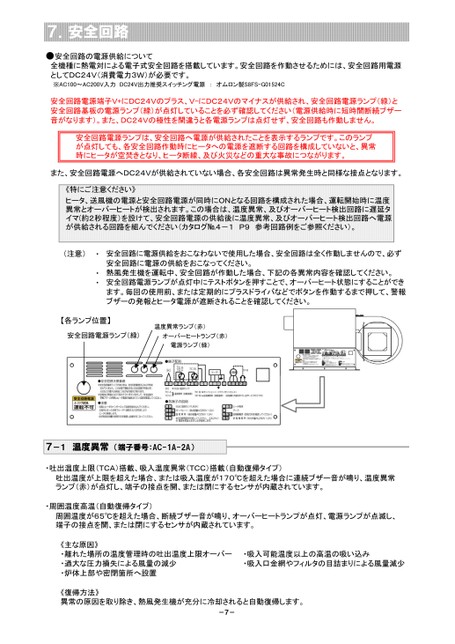 ●安全回路の電源供給について全機種に熱電対による電子式安全回路を搭載しています。安全回路を作動させるためには、安全回路用電源としてDC24V(消費電力3W)が必要です。※AC100~AC200V入力DC24V出力推奨スイッチング電源:オムロン製S8FS-G01524C安全回路電源端子V+にDC24Vのプラス、V-にDC24Vのマイナスが供給され、安全回路電源ランプ(緑)と安全回路基板の電源ランプ(緑)が点灯していることを必ず確認してください(電源供給時に短時間断続ブザー音がなります)。また、DC24Vの極性を間違うと各電源ランプは点灯せず、安全回路も作動しません。安全回路電源ランプは、安全回路へ電源が供給されたことを表示するランプです。このランプが点灯しても、各安全回路作動時にヒータへの電源を遮断する回路を構成していないと、異常時にヒータが空焚きとなり、ヒータ断線、及び火災などの重大な事故につながります。また、安全回路電源へDC24Vが供給されていない場合、各安全回路は異常発生時と同様な接点となります。《特にご注意ください》ヒータ、送風機の電源と安全回路電源が同時にONとなる回路を構成された場合、運転開始時に温度異常とオーバーヒートが検出されます。この場合は、温度異常、及びオーバーヒート検出回路に遅延タイマ(約2秒程度)を設けて、安全回路電源の供給後に温度異常、及びオーバーヒート検出回路へ電源が供給される回路を組んでください(カタログ№4-1P9参考回路例をご参照ください)。安全回路に電源供給をおこなわないで使用した場合、安全回路は全く作動しませんので、必ず安全回路に電源の供給をおこなってください。熱風発生機を運転中、安全回路が作動した場合、下記の各異常内容を確認してください。安全回路電源ランプが点灯中にテストボタンを押すことで、オーバーヒート状態にすることができます。毎回の使用前、または定期的にプラスドライバなどでボタンを作動するまで押して、警報ブザーの発報とヒータ電源が遮断されることを確認してください。・・・(注意)7.安全回路【各ランプ位置】温度異常ランプ(赤)安全回路電源ランプ(緑)オーバーヒートランプ(赤)電源ランプ(緑)7-1温度異常(端子番号:AC-1A-2A)・吐出温度上限(TCA)搭載、吸入温度異常(TCC)搭載(自動復帰タイプ)吐出温度が上限を超えた場合、または吸入温度が170℃を超えた場合に連続ブザー音が鳴り、温度異常ランプ(赤)が点灯し、端子の接点を開、または閉にするセンサが内蔵されています。・周囲温度高温(自動復帰タイプ)周囲温度が65℃を超えた場合、断続ブザー音が鳴り、オーバーヒートランプが点灯、電源ランプが点滅し、端子の接点を開、または閉にするセンサが内蔵されています。《主な原因》・離れた場所の温度管理時の吐出温度上限オーバー・過大な圧力損失による風量の減少・炉体上部や密閉箇所へ設置・吸入可能温度以上の高温の吸い込み・吸入口金網やフィルタの目詰まりによる風量減少《復帰方法》異常の原因を取り除き、熱風発生機が充分に冷却されると自動復帰します。-7-