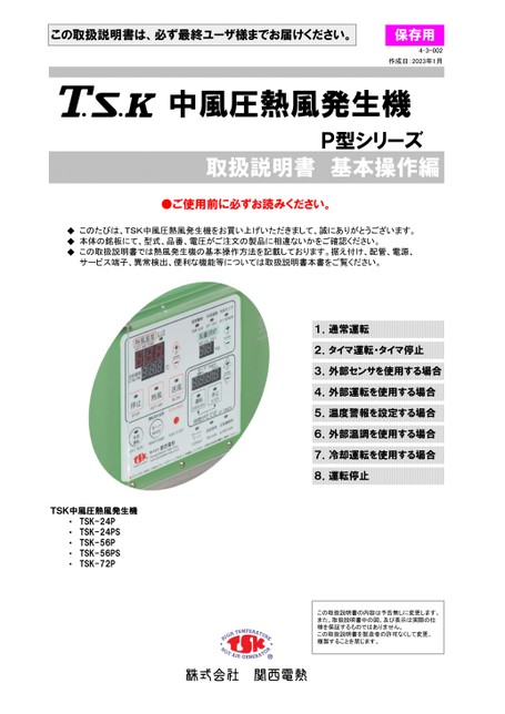 この取扱説明書は、必ず最終ユーザ様までお届けください。保存用4・3-002作成日:2023年1月中風圧熱風発生機P型シリーズ取扱説明書基本操作編●ご使用前に必ずお読みください。このたびは、TSK中風圧熱風発生機をお買い上げいただきまして、誠にありがとうございます。本体の銘板にて、型式、品番、電圧がご注文の製品に相違ないかをご確認ください。この取扱説明書では熱風発生機の基本操作方法を記載しております。据え付け、配管、電源、サービス端子、異常検出、便利な機能等については取扱説明書本書をご覧ください。◆◆◆1.通常運転2.タイマ運転・タイマ停止3.外部センサを使用する場合4.外部運転を使用する場合5.温度警報を設定する場合6.外部温調を使用する場合7.冷却運転を使用する場合8.運転停止この取扱説明書の内容は予告無しに変更します。また、取扱説明書中の図、及び表示は実際の仕様を保証するものではありません。この取扱説明書を製造者の許可なくして変更、複製することを禁じます。株式会社関西電熱TSK中風圧熱風発生機TSK-24PTSK-24PSTSK-56PTSK-56PSTSK-72P・・・・・