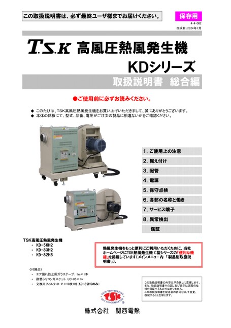 この取扱説明書は、必ず最終ユーザ様までお届けください。保存用4・4-002作成日:2024年7月高風圧熱風発生機KDシリーズ取扱説明書総合編●ご使用前に必ずお読みください。このたびは、TSK高風圧熱風発生機をお買い上げいただきまして、誠にありがとうございます。本体の銘板にて、型式、品番、電圧がご注文の製品に相違ないかをご確認ください。◆◆1.ご使用上の注意2.据え付け3.配管4.電源5.保守点検6.各部の名称と働き7.サービス端子8.異常検出保証熱風発生機をもっと便利にご利用いただくために、当社ホームページにTSK熱風発生機C型シリーズの『便利な機能』を掲載しています(メインメニュー内「製品別取扱説明書」)。この取扱説明書の内容は予告無しに変更します。また、取扱説明書中の図、及び表示は実際の仕様を保証するものではありません。この取扱説明書を製造者の許可なくして変更、複製することを禁じます。エア漏れ防止用ガラステープ:1m×1本耐熱シリコンガスケットUC-85×1ヶ交換用フィルタ81-P×10枚1組(KD-82H5のみ)・・・《付属品》TSK高風圧熱風発生機KD-56H2KD-83H2KD-82H5・・・