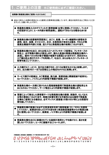 1.ご使用上の注意※ご使用前に必ずご確認ください。故障無く熱風発生機をご使用いただくために◆過去に発生した故障の原因となった重要な注意事項を記載しています。貴社の使用方法とご照合いただきますよう、お願い申し上げます。●熱風発生機吸入口のデミフィルタ(標準装備)は常に清掃してください。フィルタの目詰まりにより、ヒータ内部が異常過熱し、運転ができなくなる場合もあります。●熱風発生機の設置場所雰囲気に、ほこり、粉塵、カーボン繊維等の通電性浮遊物、油分、油煙、オイルミスト、水分、水蒸気体が含まれる場合、それらが熱風発生機操作内部に付着、混入すると熱風発生機の故障につながります。●熱風発生機の吐出口、または吸入口へのフレキホース配管は、フレキホースの特性上、必ず熱風の漏れが発生します。漏れた高温の熱風は熱風発生機内へ逆流し、操作パネル内の電子機器が破損する原因となりますので、同封されたエア漏れ防止用ガラステープを利用して、吐出口、または吸入口へフレキホース配管を施工してください。●入力端子A1~A10、及び出力端子B8~B10は電圧をかけると故障します。また、出力端子B1~B7は定格以上の電圧をかけると故障します。●サービス端子の配線は、AC電源線、動力線、高調波線と隣接配線や結束をしないでください。ノイズにより内部電子機器が破損します。●熱風発生機の一次側に設けられた電磁接触器等で熱風発生機の運転停止をおこなわないでください。サージ電圧により内部電子機器が破損します。●落雷によって発生した誘導雷サージは熱風発生機の損傷、誤動作、もしくは火災等の事故につながります。落雷の影響を受ける可能性のある場所で熱風発生機をご使用になる場合は、必ずアレスタ(避雷器)の取り付け等による落雷対策を施してください。●熱風発生機の電源には必ず正弦波波形を持つ商用電源(50/60Hz)を使用してください。高調波を含んだひずみ波を持つ周波数変換器等からの電源は絶対に使用しないでください。高調波、ノイズ等により内部電子機器が破損します。●熱風発生機吐出口に装備されている温度計測用センサを曲げたり、高さを変更しないでください。ヒータに接触するとショートします。-1-