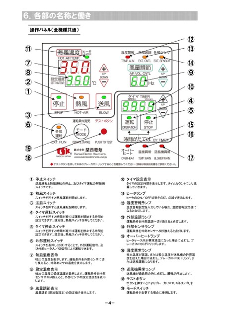 ⑫⑬⑭⑨⑩④⑤⑮⑯⑰6.各部の名称と働き操作パネル(全機種共通)⑪⑦⑧②①③⑥⑲⑱①②③④⑤⑥⑦⑧停止スイッチ送風運転と熱風運転の停止、及びタイマ運転の解除用スイッチです。熱風スイッチスイッチを押すと熱風運転を開始します。送風スイッチスイッチを押すと送風運転を開始します。タイマ運転スイッチスイッチを押すと時間が経てば運転を開始する時間を設定できます。設定後、熱風スイッチを押してください。タイマ停止スイッチスイッチを押すと時間が経てば運転を停止する時間を設定できます。設定後、熱風スイッチを押してください。外部運転スイッチスイッチを長押し(2秒)することで、外部運転信号、及び外部ヒータ入/切信号により運転できます。熱風温度表示吐出口温度を表示します。運転条件を外部センサに切り換えると、外部センサの温度を表示します。設定温度表示吐出口温度の設定温度を表示します。運転条件を外部センサに切り換えると、外部センサの設定温度をを表示します。⑨風量調節表示風量調節(周波数設定)の設定値を表示します。⑩⑪⑫⑬⑭⑮⑯⑰⑱⑲タイマ設定表示タイマの設定時間を表示します。タイムカウントにより減算していきます。ヒータランプヒータのON/OFF状態を点灯、点滅で表示します。温度警報ランプ温度警報設定を入力している場合、温度警報設定値になると点灯します。外部温調ランプ運転条件を外部温調へ切り換えると点灯します。外部センサランプ運転条件を外部センサへ切り換えると点灯します。オーバーヒートランプヒータケース内が異常高温になった場合に点灯し、ブレーカ(NFB)がトリップします。温度異常ランプ吐出温度が高温、または吸入温度が送風機の許容温度を超えた場合に点灯し、ブレーカ(NFB)トリップ、または送風運転になります。送風機異常ランプ送風機が過負荷の時に点灯し、運転が停止します。テストボタンボタンを押すことによりブレーカ(NFB)がトリップします。モードスイッチ運転条件を変更する場合に使用します。-4-