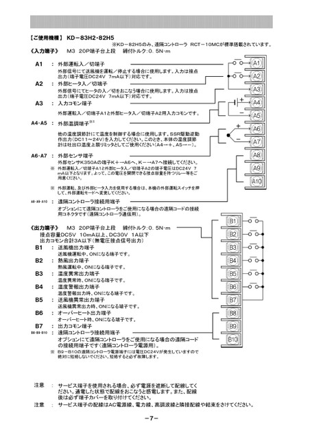 【ご使用機種】KD-83H2・82H5《入力端子》M320P端子台上段締付トルク:0.5N・m※KD-82H5のみ、遠隔コントローラRCT-10MCが標準搭載されています。A1:外部運転入/切端子外部信号にて送風機を運転/停止する場合に使用します。入力は接点出力(端子電圧DC24V7mA以下)対応です。A2:外部ヒータ入/切端子外部信号にてヒータの入/切をおこなう場合に使用します。入力は接点出力(端子電圧DC24V7mA以下)対応です。A3:入力コモン端子外部運転入/切端子A1と外部ヒータ入/切端子A2用入力コモンです。A4・A5:外部温調端子※1他の温度調節計にて温度を制御する場合に使用します。SSR駆動逆動作出力(DC11~24V)を入力してください。このとき、本体の温度調節計は吐出口温度上限リミッタとしてご使用ください(A4→+、A5→-)。A6・A7:外部センサ端子外部センサK350Aの端子K+→A6へ、K-→A7へ接続してください。※外部運転入/切端子A1と外部ヒータ入/切端子A2の端子電圧はDC24V7mA以下となります。よって、この電圧を開閉できる接点容量を持つリレー等をご用意ください。※外部運転、及び外部ヒータ入力を使用する場合は、本機の外部運転スイッチを押して、外部運転モードへ変更してください。A8・A9・A10:遠隔コントローラ接続用端子オプションにて遠隔コントローラをご使用になる場合の遠隔コードの接続用コネクタです(遠隔コントローラ通信用)。《出力端子》M320P端子台上段締付トルク:0.5N・m接点容量DC5V10mA以上、DC30V1A以下出力コモン合計3A以下(無電圧接点信号出力)送風機出力端子送風機運転中、ONになる端子です。熱風出力端子熱風運転中、ONになる端子です。温度異常出力端子温度異常時、ONになる端子です。温度警報出力端子温度警報出力時、ONになる端子です。送風機異常出力端子送風機異常出力時、ONになる端子です。オーバーヒート出力端子オーバーヒート時、ONになる端子です。出力コモン端子遠隔コントローラ接続用端子::::::::B1B2B3B4B5B6B7B8・B9・B10オプションにて遠隔コントローラをご使用になる場合の遠隔コードの接続用端子です(遠隔コントローラ電源用)。※B9-B10の遠隔コントローラ電源端子には電圧DC24Vが発生していますので絶対に短絡しないでください。短絡すると必ず故障します。注意注意::サービス端子を使用される場合、必ず電源を遮断して配線してください。通電した状態で配線をおこなうと感電します。また、配線後は必ず端子カバーを取り付けてください。サービス端子の配線はAC電源線、電力線、高調波線と隣接配線や結束をさけてください。-7-