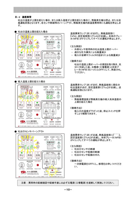 8-2温度異常吐出口温度が上限を超えた場合、または吸入温度が上限を超えた場合に、熱風発生機は停止、または送風運転状態となります。各センサ断線等のバーンアウト、熱風発生機内部温度異常時にも運転を停止します。温度異常ランプ(赤)が点灯し、熱風温度部に『nFb』、設定温度部に『TcA』が点滅し、本体のブレーカ(NFB)がトリップしてすべての運転が停止します。外部センサ使用時の吐出温度上限オーバー過大な圧力損失による風量減少吸入口金網やフィルタの詰まりによる風量減少・・・《主な原因》《復帰方法》吐出口温度上限オーバーの原因を取り除き、充分に冷却した後、元電源(工場電源)と本体ブレーカ(NFB)をいったんOFFにして、再度ONしてください。温度異常ランプ(赤)が点灯、熱風温度部に現在の吐出温度が点灯、設定温度部に『Tcc』が点滅し、送風運転状態となります。《主な原因》・熱風循環温度が熱風発生機の吸入気体温度の上限を超えた場合《復帰方法》吸入口の温度が下がった後、停止スイッチを押すことで解除できます。温度異常ランプ(赤)が点滅、熱風温度部に『---』、設定温度部に『TcA』が点滅し、本体ブレーカ(NFB)がトリップしてすべての運転が停止します。一次側電源をOFFにし、修理をお申しつけください。吐出口センサの断線吐出口センサ配線の断線吐出口センサ配線の外れ・・・《主な原因》《復帰方法》●吐出口温度上限を超えた場合●吸入温度上限を超えた場合●吐出口センサバーンアウト注意:異常時の配線確認や配線手直しは必ず元電源(工場電源)を遮断して実施してください。-10-