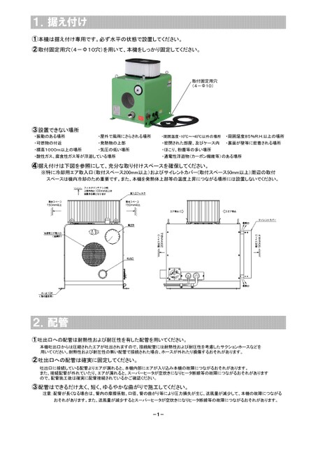 1.据え付け①本機は据え付け専用です。必ず水平の状態で設置してください。②取付固定用穴(4-Φ10穴)を用いて、本機をしっかり固定してください。取付固定用穴(4-Φ10)③設置できない場所・振動のある場所・可燃物の付近・屋外で風雨にさらされる場所・周囲温度-10℃~+40℃以外の場所・周囲湿度85%R.H.以上の場所・発熱物の上部・密閉された部屋、及びケース内・裏面が壁等に密着される場所・標高1000m以上の場所・気圧の低い場所・ほこり、粉塵等の多い場所・酸性ガス、腐食性ガス等が浮遊している場所・通電性浮遊物(カーボン繊維等)のある場所④据え付けは下図を参照にして、充分な取り付けスペースを確保してください。※特に冷却用エア取入口(取付スペース200mm以上)およびサイレントカバー(取付スペース50mm以上)周辺の取付スペースは機内冷却のため重要です。また、本機を発熱体上部等の温度上昇につながる場所には設置しないでください。2.配管①吐出口への配管は耐熱性および耐圧性を有した配管を用いてください。本機吐出口からは圧縮されたエアが吐出されますので、接続配管には耐熱性および耐圧性を考慮したサクションホースなどを用いてください。耐熱性および耐圧性の無い配管で接続された場合、ホースが外れたり損傷するおそれがあります。②吐出口への配管は確実に固定してください。吐出口に接続している配管よりエアが漏れると、本機内部にエアが入り込み本機の故障につながるおそれがあります。また、接続配管が外れていたり、エアが漏れると、スーパーヒータが空炊きになりヒータ断線等の故障につながるおそれがありますので、配管施工後は確実に配管接続されているかご確認ください。③配管はできるだけ太く、短く、ゆるやかな曲がりで施工してください。注意:配管が長くなる場合は、管内の摩擦係数、口径、管の曲がり等により圧力損失が生じ、送風量が減少して、本機の故障につながるおそれがあります。また、送風量が減少するとスーパーヒータが空炊きになりヒータ断線等の故障につながるおそれがあります。-1-