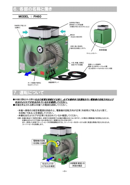 6.各部の名称と働きMODEL:FH60冷却用エア取入口(金網付)洗浄再生可能な高性能フィルタを装備(対象粒子径:約3ミクロン以上)静圧計(吐出圧力表示用)非常に高い防音性、換気性を実現したボディ本体背面サイレントカバー小型、軽量、高風圧渦流ブロワを搭載温調ユニット接続用電源・圧力信号コード3m付属(圧力信号コードはFH50・60に付属)ホース接続が容易な吐出口(ソケット)風量調節ダンパ7.運転について●本機を運転される際は吐出口配管を接続をする前に、必ず本機単体で試運転を行い電動機の回転方向および吐出口よりエアが吐出されているかを確認してください。●本機を停止される際は本機への電源を遮断してください。・本機へ順相の3相定格電源を供給の上、電動機の回転方向が正常(冷却用エア吸入口より見て、右回転)であることを確認してください。・本機吐出口よりエアが正常に吐出されているか確認してください。注意:本機を単品でご使用の場合、逆相や欠相状態でも本機の運転はおこないますが、この場合は電動機が逆回転となるため、本機吐出口よりエアを吸い込み逆流となり、破損のおそれがあります。また、逆流した状態でスーパーヒータの熱風運転を行うと、スーパーヒータのターミナル部に高温な熱風が流入されるため、スーパーヒータは故障します。電動機の回転(右回転)を確認吐出口よりのエア吐出を確認3相電源(順相)の供給を確認-3-