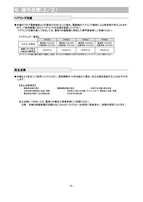 9.保守点検(2/2)ベアリング交換◆本機のブロワ電動機部よりの異音が大きくなった場合、電動機のベアリング摩耗による寿命等が考えられますので、ご使用機種に応じたベアリングの交換を実施してください。ベアリング交換作業につきましては、最寄りの電動機に熟知した専門業者様にご依頼ください。《ベアリング一覧表》FH30FH40FH50FH60ベアリング型式翼車側:6202ZZ翼車側:6204ZZ翼車側:6206ZZ翼車側:6206ZZ反翼車側:6202ZZ反翼車側:6203ZZ反翼車側:6303ZZ反翼車側:6205ZZ搭載ブロワ型式(3相200V標準品)VFZ301AVFZ401AVFZ501AVFZ601A※ベアリング交換は最大負荷で運転した場合、約18000時間または約2年を寿命としてメンテナンスをご検討ください。自主点検◆本機をより安全にご使用いただくために、使用期間が10年を越えた場合、自主点検を実施することをおすすめします。【自主点検項目】・・・絶縁抵抗値の測定・電動機電流値の測定・各端子台の増し締め点検本体内部の異物混入点検、清掃電気部品の動作、及び発熱点検・・冷却用エア取入口金網、サイレントカバー異物混入点検、清掃その他の目視点検自主点検につきましては、最寄りの電気工事業者様にご依頼ください。注意:本機の絶縁耐電圧試験はおこなわないでください(出荷時に実施済み)。故障の原因になります。-5-