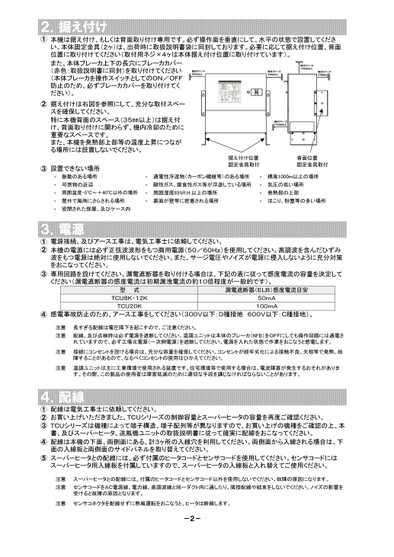 ①②③・・・・・・・・・・・・・①②③④①②③④⑤-2-注意スーパーヒータとの配線には、付属のヒータコードとセンサコード以外を使用しないでください。故障の原因になります。注意センサコードをAC電源線、電力線、高調波線と同一ダクト内に通したり、隣接配線や結束をしないでください。ノイズの影響を受けると故障の原因となります。注意温調ユニットは主に工業環境で使用される装置です。住宅環境等で使用する場合は、電波障害が発生するおそれがあります。その際、この製品の使用者は障害低減のために適切な手段を講じなければならないことがあります。注意センサコネクタを配線せずに熱風運転をおこなうと、ヒータは断線します。配線は電気工事士に依頼してください。お買い上げいただきました、TCUシリーズの制御容量とスーパーヒータの容量を再度ご確認ください。TCUシリーズは機種によって端子構造、端子配列等が異なりますので、お買い上げの機種をご確認の上、本書、及びスーパーヒータ、送風機ユニットの取扱説明書に従って確実に配線をおこなってください。配線は本機の下面、両側面にある、計3ヶ所の入線穴を利用してください。両側面から入線される場合は、下面の入線板と両側面のサイドパネルを取り替えてください。スーパーヒータとの配線には、必ず付属のヒータコードとセンサコードを使用してください。センサコードにはスーパーヒータ用入線板を付属していますので、スーパーヒータの入線板と入れ替えてご使用ください。4.配線注意配線、及び点検時は必ず電源を遮断してください。温調ユニットは本体のブレーカ(NFB)をOFFにしても操作回路には通電されていますので、必ず工場元電源(一次側電源)を遮断してください。電源を入れた状態で作業をおこなうと感電します。注意接続にコンセントを設ける場合は、充分な容量を確保してください。コンセントが経年劣化による接触不良、欠相等で発熱、故障することがあるので、なるべくコンセントの使用はひかえてください。TCU20K100mA感電事故防止のため、アース工事をしてください(300V以下:D種接地600V以下:C種接地)。注意長すぎる配線は電圧降下を起こすので、ご注意ください。本機の電源には必ず正弦波波形をもつ商用電源(50/60Hz)を使用してください。高調波を含んだひずみ波をもつ電源は絶対に使用しないでください。また、サージ電圧やノイズが電源に侵入しないように充分対策をおこなってください。専用回路を設けてください。漏電遮断器を取り付ける場合は、下記の表に従って感度電流の容量を決定してください(漏電遮断器の感度電流は初期漏洩電流の約10倍程度が一般的です)。型式漏電遮断器(ELB)感度電流目安TCU8K・12K50mA密閉された部屋、及びケース内3.電源電源接続、及びアース工事は、電気工事士に依頼してください。周囲温度-5℃~+40℃以外の場所周囲湿度85%R.H.以上の場所発熱部の上部屋外で風雨にさらされる場所裏面が壁等に密着される場所ほこり、粉塵等の多い場所設置できない場所振動のある場所通電性浮遊物(カーボン繊維等)のある場所標高1000m以上の場所可燃物の近辺酸性ガス、腐食性ガス等が浮遊している場所気圧の低い場所特に本機背面のスペース(35㎜以上)は据え付け、背面取り付けに関わらず、機内冷却のために重要なスペースです。また、本機を発熱部上部等の温度上昇につながる場所には設置しないでください。2.据え付け本機は据え付け、もしくは背面取り付け専用です。必ず操作面を垂直にして、水平の状態で設置してください。本体固定金具(2ヶ)は、出荷時に取扱説明書袋に同封しております。必要に応じて据え付け位置、背面位置に取り付けてください(取付用ネジ×4ヶは本体据え付け位置に取り付けています)。また、本体ブレーカ上下の長穴にブレーカカバー(赤色:取扱説明書に同封)を取り付けてください(本体ブレーカを操作スイッチとしてのON/OFF防止のため、必ずブレーカカバーを取り付けてください)。据え付けは右図を参照にして、充分な取付スペースを確保してください。据え付け位置固定金具取付背面位置固定金具取付