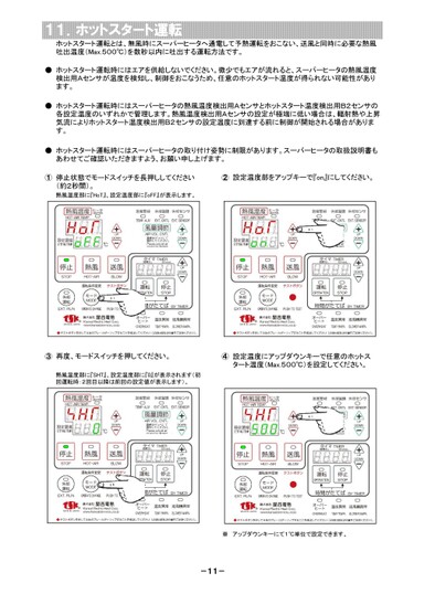 ●●●①②③④※-11-アップダウンキーにて1℃単位で設定できます。熱風温度部に『SHT』、設定温度部に『0』が表示されます(初回運転時:2回目以降は前回の設定値が表示します)。再度、モードスイッチを押してください。設定温度にアップダウンキーで任意のホットスタート温度(Max.500℃)を設定してください。熱風温度部に『HoT』、設定温度部に『oFF』が表示します。ホットスタート運転時にはスーパーヒータの取り付け姿勢に制限があります。スーパーヒータの取扱説明書もあわせてご確認いただきますよう、お願い申し上げます。停止状態でモードスイッチを長押ししてください(約2秒間)。設定温度部をアップキーで『on』にしてください。ホットスタート運転時にはエアを供給しないでください。微少でもエアが流れると、スーパーヒータの熱風温度検出用Aセンサが温度を検知し、制御をおこなうため、任意のホットスタート温度が得られない可能性があります。ホットスタート運転時にはスーパーヒータの熱風温度検出用Aセンサとホットスタート温度検出用B2センサの各設定温度のいずれかで管理します。熱風温度検出用Aセンサの設定が極端に低い場合は、輻射熱や上昇気流によりホットスタート温度検出用B2センサの設定温度に到達する前に制御が開始される場合があります。11.ホットスタート運転ホットスタート運転とは、無風時にスーパーヒータへ通電して予熱運転をおこない、送風と同時に必要な熱風吐出温度(Max.500℃)を数秒以内に吐出する運転方法です。