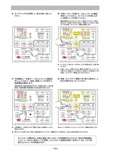 ⑤⑥※※⑦⑧※※ホットスタート運転時は、急激な温度上昇によるヒータの損傷を防止するため、独自の制御機能により、ヒータ出力上限を2/3に抑制し、ホットスタート温度指示値が1秒あたり、約2.5℃で昇温するようにヒータが制御されます。-12-外部運転入/切端子がOFF(開放)状態では熱風スイッチは無効となります。停止スイッチを押すことにより、ホットスタート運転は停止します。停止スイッチを押した後、再度、同温度条件でホットスタート運転をおこなう場合は、上記⑥以降の操作のみとなります。外部運転入/切端子1-3をコンプレッサ運転信号によってONにし、再度、熱風スイッチを押すと、熱風運転を開始します。再度、ホットスタート運転に切り替える場合は、上記⑥の操作をおこなってください。熱風温度部に熱風温度検出用Aセンサ温度を表示し、設定温度部には通常運転(熱風運転)の設定温度が表示します。ヒータランプ(緑)はヒータのON/OFF状態を点灯、点滅で表示します。外部ヒータ入/切端子がOFF(開放)の状態でモードスイッチを押しながら熱風スイッチを押すと、送風ランプと熱風ランプが点滅し、ホットスタート運転はおこなわれません。モードスイッチを2回押して、停止状態へ戻してください。外部ヒータ入/切端子2-3をコンプレッサ運転信号によってONにし、モードスイッチを押しながら、熱風スイッチを押してください。熱風温度部に『Hot』とホットスタート温度(ホットスタート検出用B2センサ温度)が交互に表示し、熱風ランプが点灯、送風ランプが点滅し、ホットスタート運転が開始します。