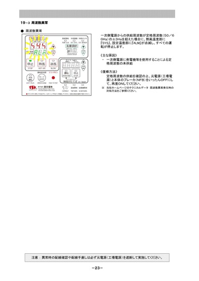 ●・※注意:異常時の配線確認や配線手直しは必ず元電源(工場電源)を遮断して実施してください。-23-当社ホームページのテクニカルデータ周波数異常発生時の対処方法をご参照ください。《復帰方法》定格周波数の供給を確認の上、元電源(工場電源)と本体のブレーカ(NFB)をいったんOFFにして、再度ONしてください。《主な原因》一次側電源に発電機等を使用することによる定格周波数の未供給周波数異常一次側電源からの供給周波数が定格周波数(50/60Hz)の±3Hzを超えた場合に、熱風温度部に『SYS』、設定温度部に『ALM』が点滅し、すべての運転が停止します。19-3周波数異常