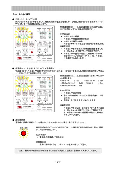●・・・・・・●・・・●・注意:異常時の配線確認や配線手直しは必ず元電源(工場電源)を遮断して実施してください。-24-《主な原因》電源線の逆接続、T相の断線《復帰方法》電源の接続線のうち、いずれか2線を入れ替えてください。逆相異常時電源線の接続が逆相になった場合や、T相が欠相になった場合、操作不可となります。各表示が本体のブレーカ(NFB)をONにした時と同じ表示内容となり、別途、逆相ランプ(赤)が点滅します。雰囲気、及び吸入温度がマイナス温度《復帰方法》外部センサを確認後、またはマイナス条件を改善後、停止スイッチを押すことによって解除できます。外部センサ以外の逆接続の場合は、修理をお申しつけください。《主な原因》外部センサの逆接続各センサ(外部センサ以外)の配線手直しによる逆接続・入口センサ:Tcc・過熱防止用B2センサ:Tcb・過熱防止用B1センサ:TcM各温度センサ逆接続、またはマイナス温度検知各温度センサ(外部センサ含む)が逆接続の場合、または-15℃以下を感知した場合(内部温度センサのみ-10℃)、すべての運転は停止します。熱風温度部に『---』、設定温度部に各センサの表示が点滅します。・外部センサ:Tc0・吐出口センサ:TcA《復帰方法》外部センサをの断線および配線状態を改善した後、停止スイッチを押すことで解除できます。外部センサ未使用の場合は、外部センサモード設定をOFFにしてください(P.14「13.外部センサを使用する場合」参照)。外部センサ補償導線部の断線外部センサ端子の外れ外部センサモードの誤設定(外部センサ未使用時)《主な原因》外部センサの断線外部センサバーンアウト時オプションの外部センサを使用して、離れた場所の温度を管理している場合、外部センサが断線等のバーンアウト時、すべての運転は停止します。熱風温度部に『---』、設定温度部に『Tc0』が点滅します(外部センサランプは点灯状態です)。8-4その他の異常